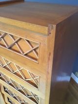 Chiffonnier en chêne clair et décor de rotin typique des années 50/60. Les 6 tiroirs coulissent très bien, pas de manque de rotin. Seul un petit manque de placage sur le haut. Bien juché sur ces pieds compas il s’intégrera dans une belle chambre d’enfant grâce à ces petites dimensions.