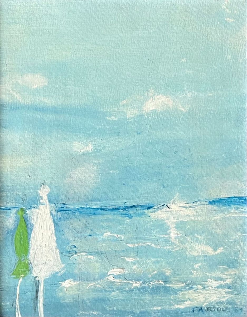 Les parasols, huile sur carton entoilé et encadré. œuvre 19 X 24 cm.