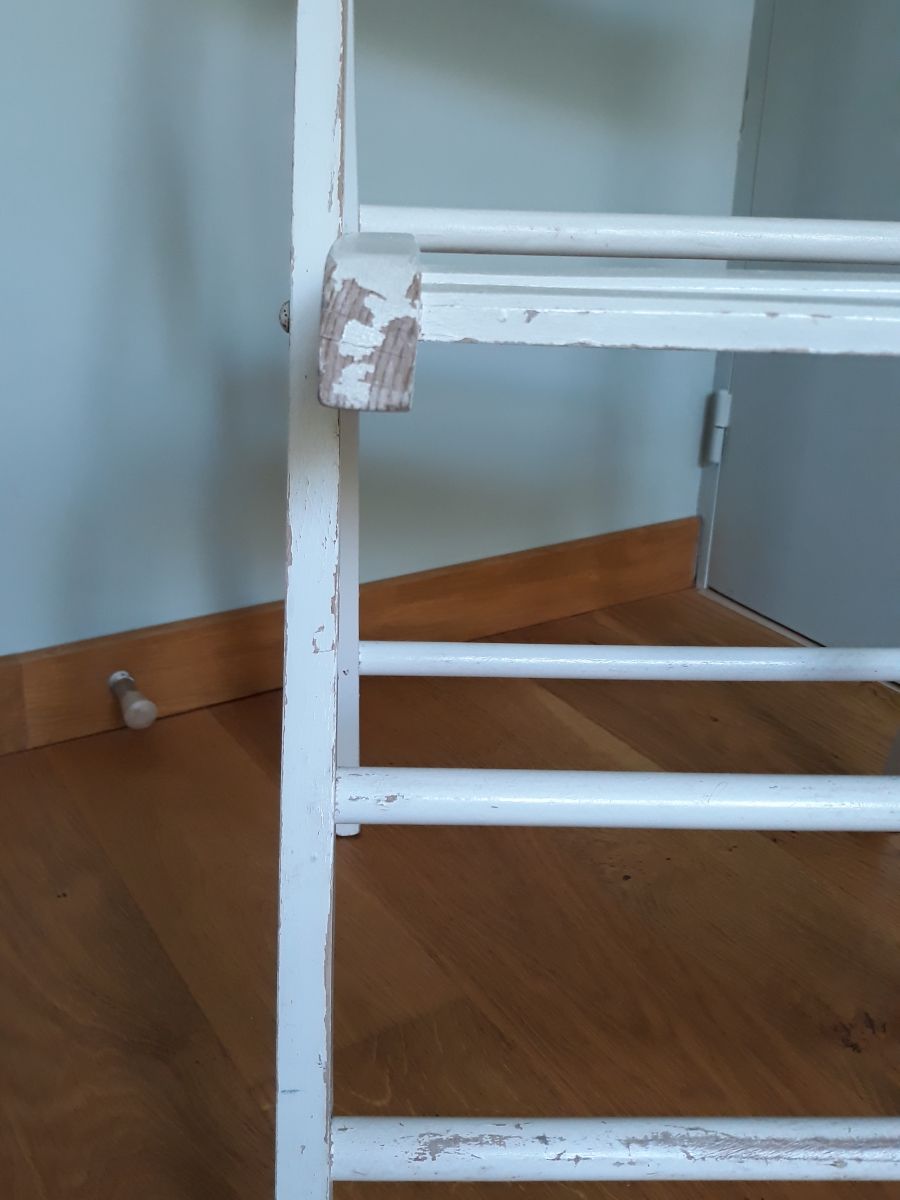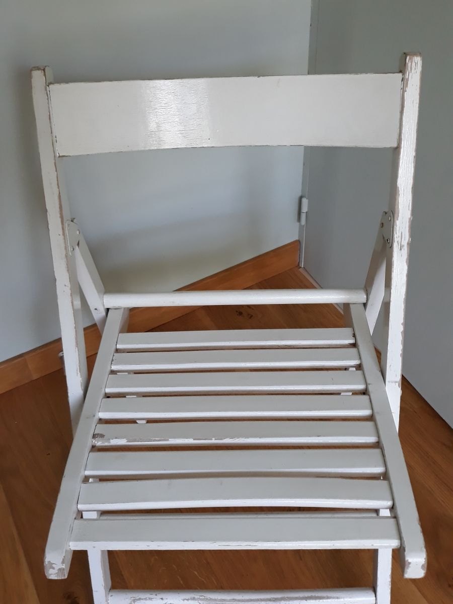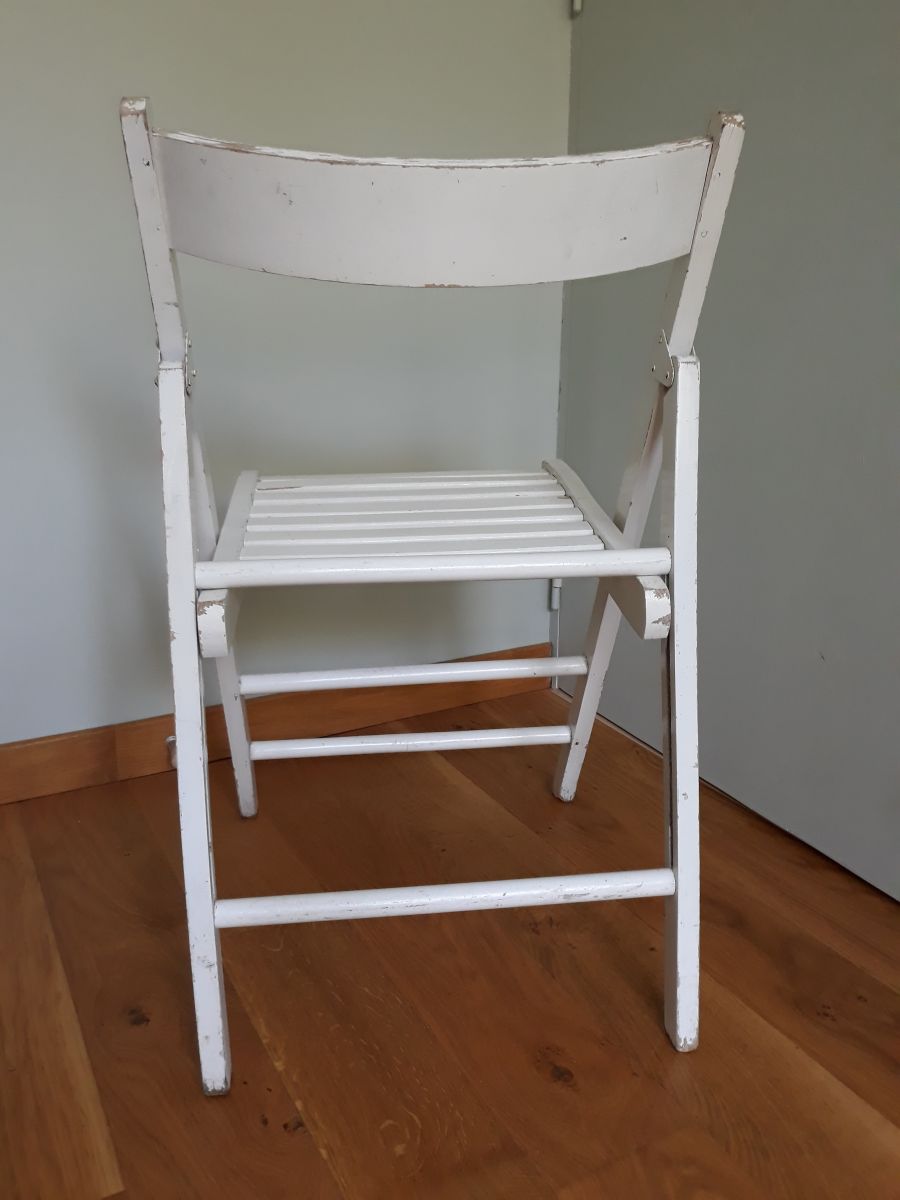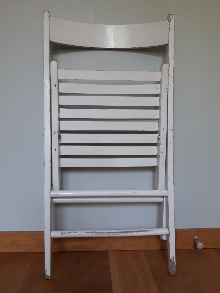 Charmante chaise qui trouvera sa place partout : sur la terrasse, dans l'entrée, autour de la table de la cuisine, ou encore dans la chambre. Dépliée, c'est une chaise plutôt confortable. Une fois repliée, elle prend peu d'espace et se range ou voyage facilement. Elle est tout en bois peint en blanc. Elle date probablement des années 60 ou 70. Je l'ai nettoyée avec soin. Elle est stable et encore solide mais ne cache pas son âge et c'est ça qui fait son charme, non : la peinture s'écaille par endroits, j'ai poncé légèrement les parties écaillées. Elle présente quelques taches et des marques diverses, un peu de rouille sur les charnières métalliques et l'un des pieds était abîmé au bout, j'ai comblé le manque avec de la pâte à bois. Pliée, elle mesure 88 cm de hauteur pour 43 cm de largeur et 10 cm d'épaisseur. Dépliée, elle mesure 77 cm de hauteur, 44 cm de hauteur d'assise, et son encombrement au sol est de 43 cm de largeur par 50 cm de profondeur. Elle pèse entre 3 et 4 kg.