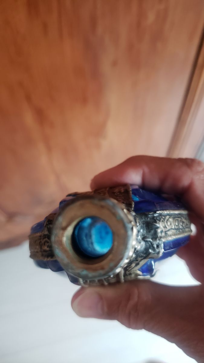 Alliance de verre bleu cobalt à du métal argenté. Hauteur de l'ensemble 25 cm. Flacon provenant de la maison LT PIVER Paris.