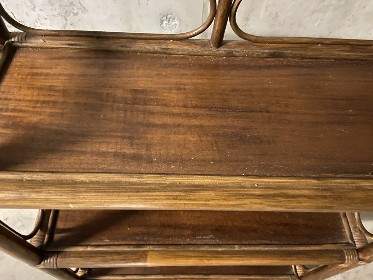 Etagère en rotin des années 60, 3 plateaux (60x20cm), superbe patine, dimensions (cm) : L.65xH.89xP.26, bon état.