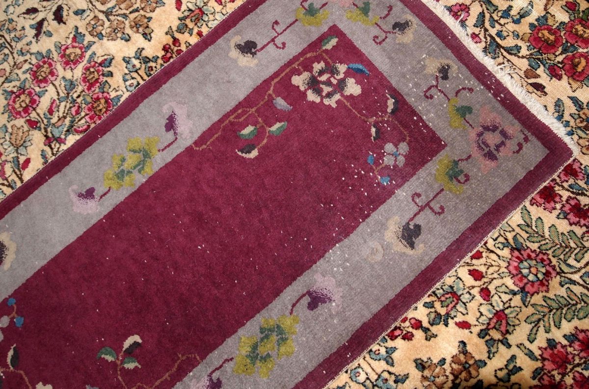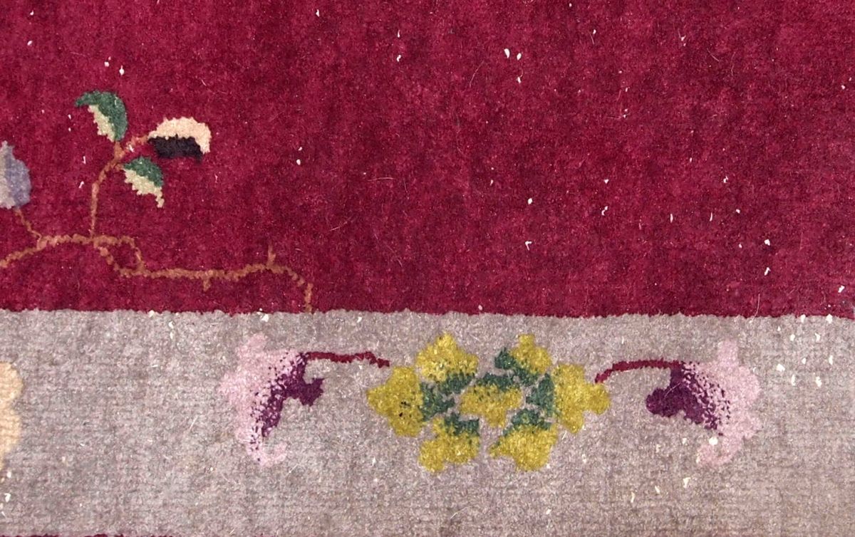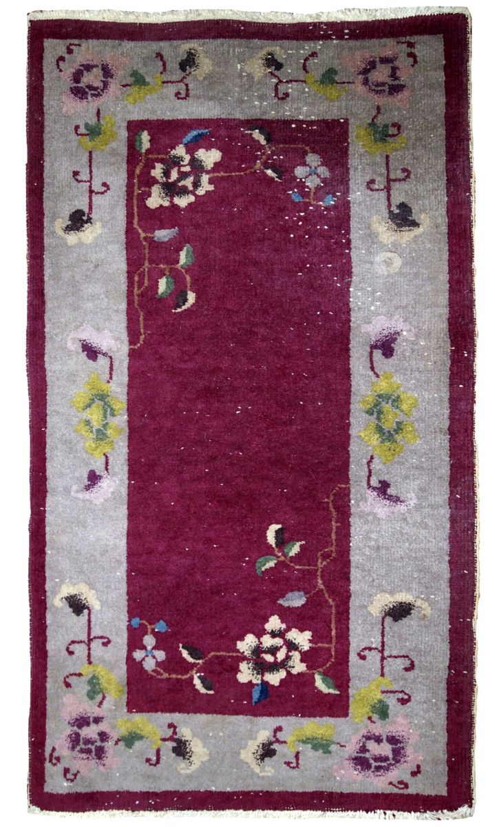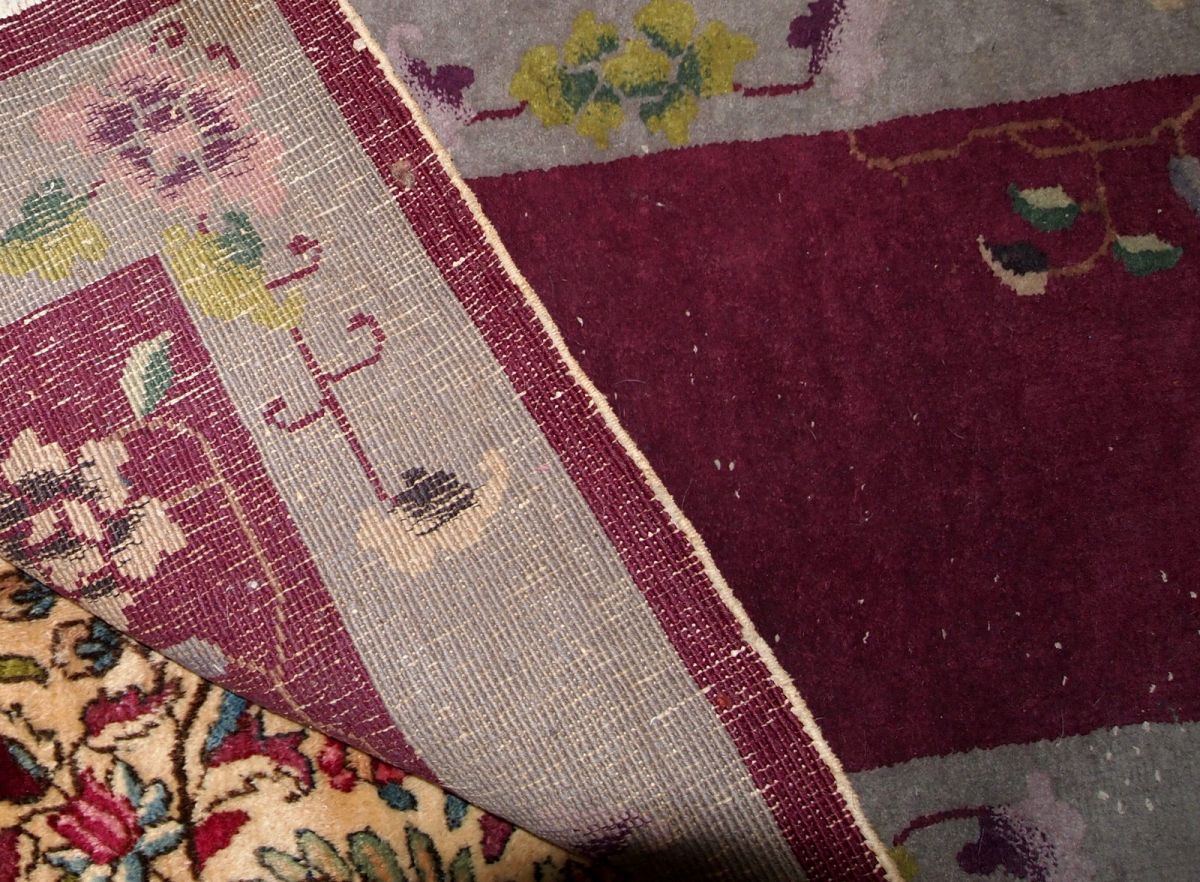 Antique Art Deco Chinese rug in bordeaux and silver shades. The rug is from 1920s in original good condition.