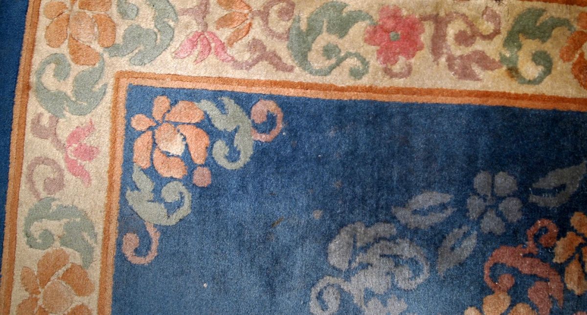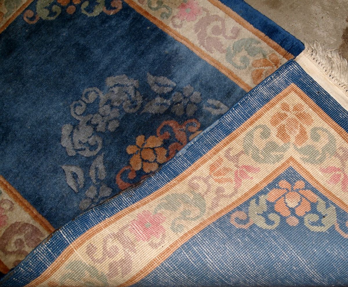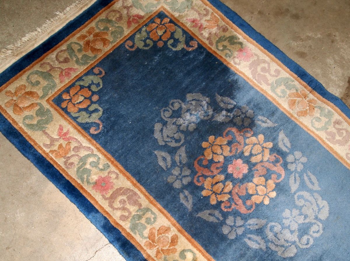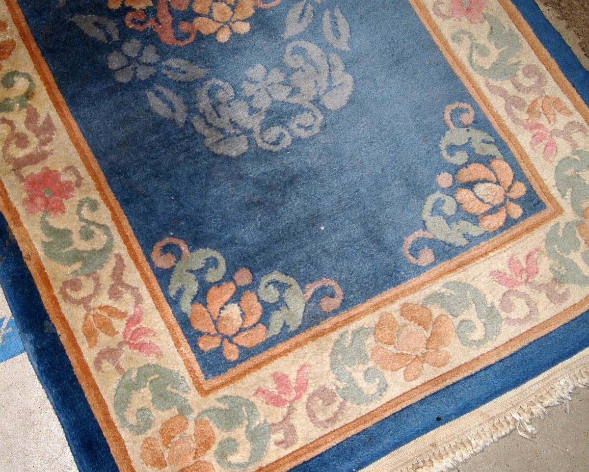Antique handmade Art Deco Chinese rug in blue shade and traditional floral design. The rug is from 1960s in original good condition.