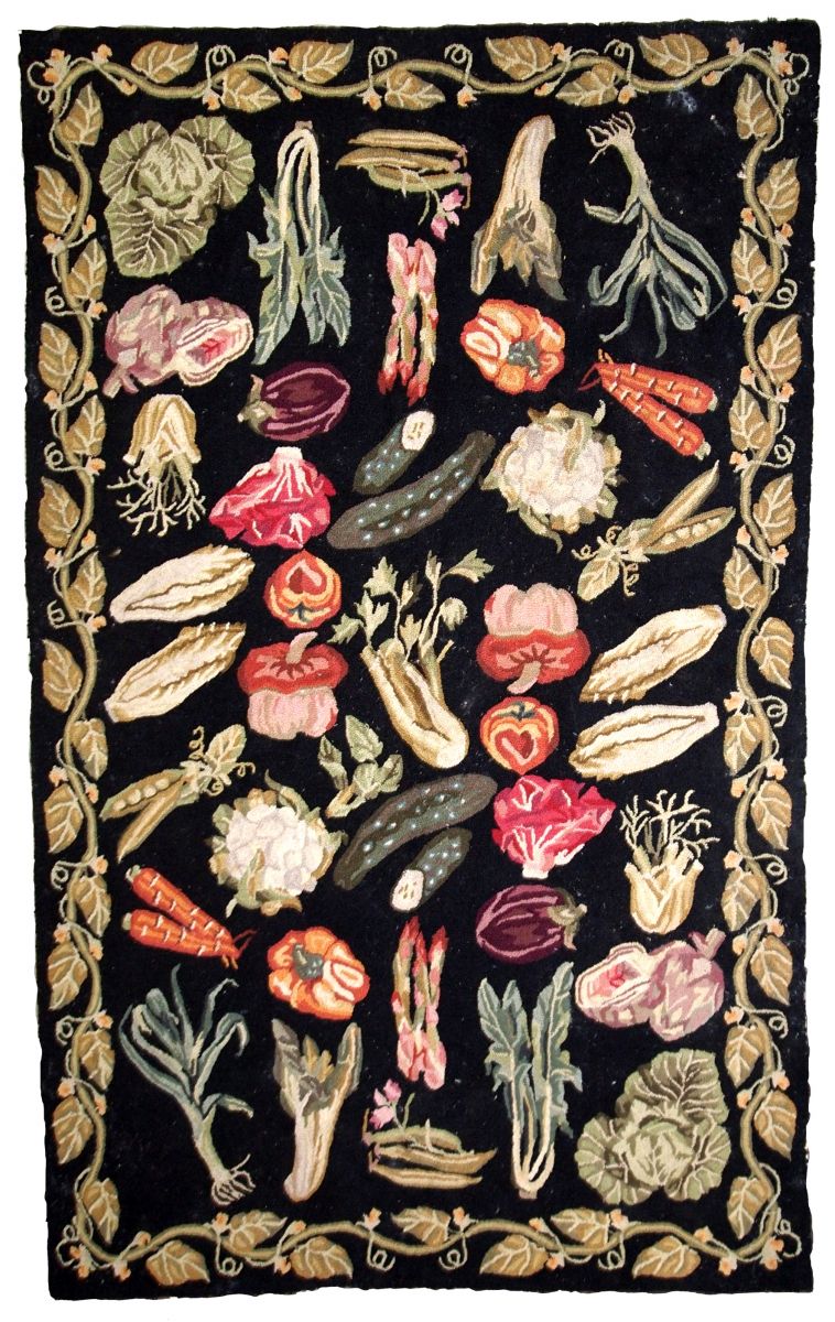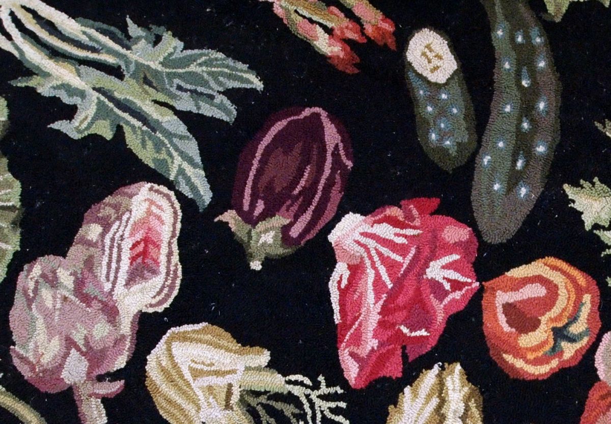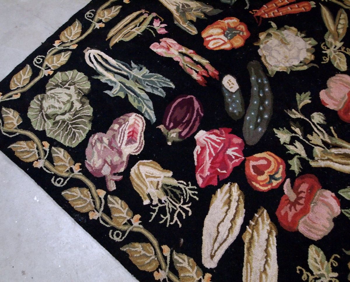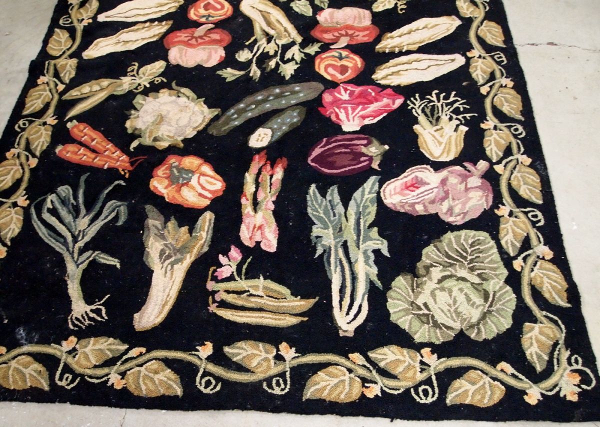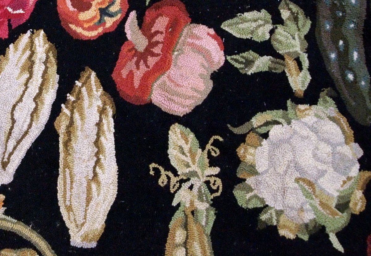 Handmade antique American Hooked rug in black colour with variety of vegetables. This rug has been made in the beginning of 20th century, it remains in original good condition.