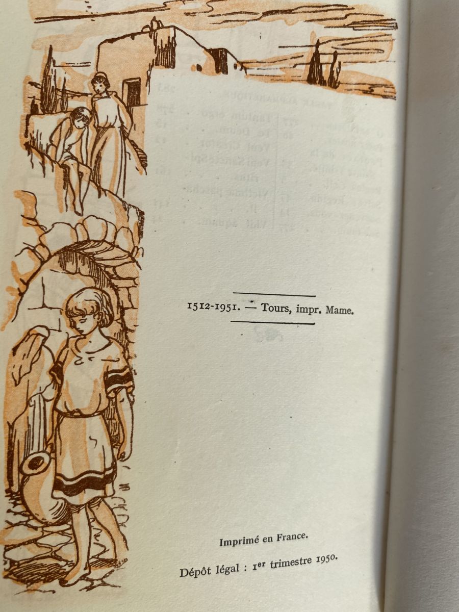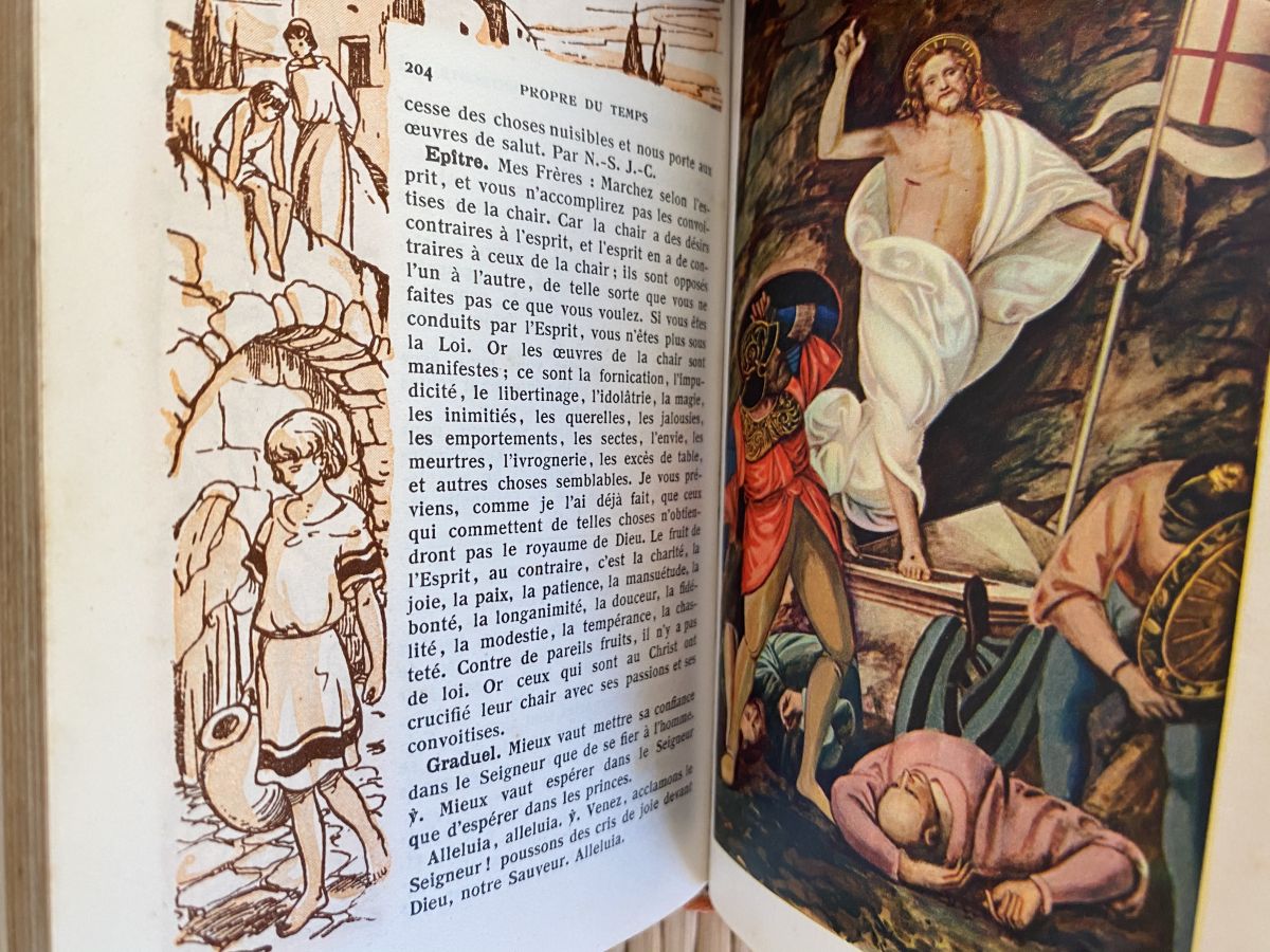 Bel état de conservation pour ce Missel de la Sainte Famille de 1950 offert à l’occasion d’une communion. Missel illustré. Français et latin.