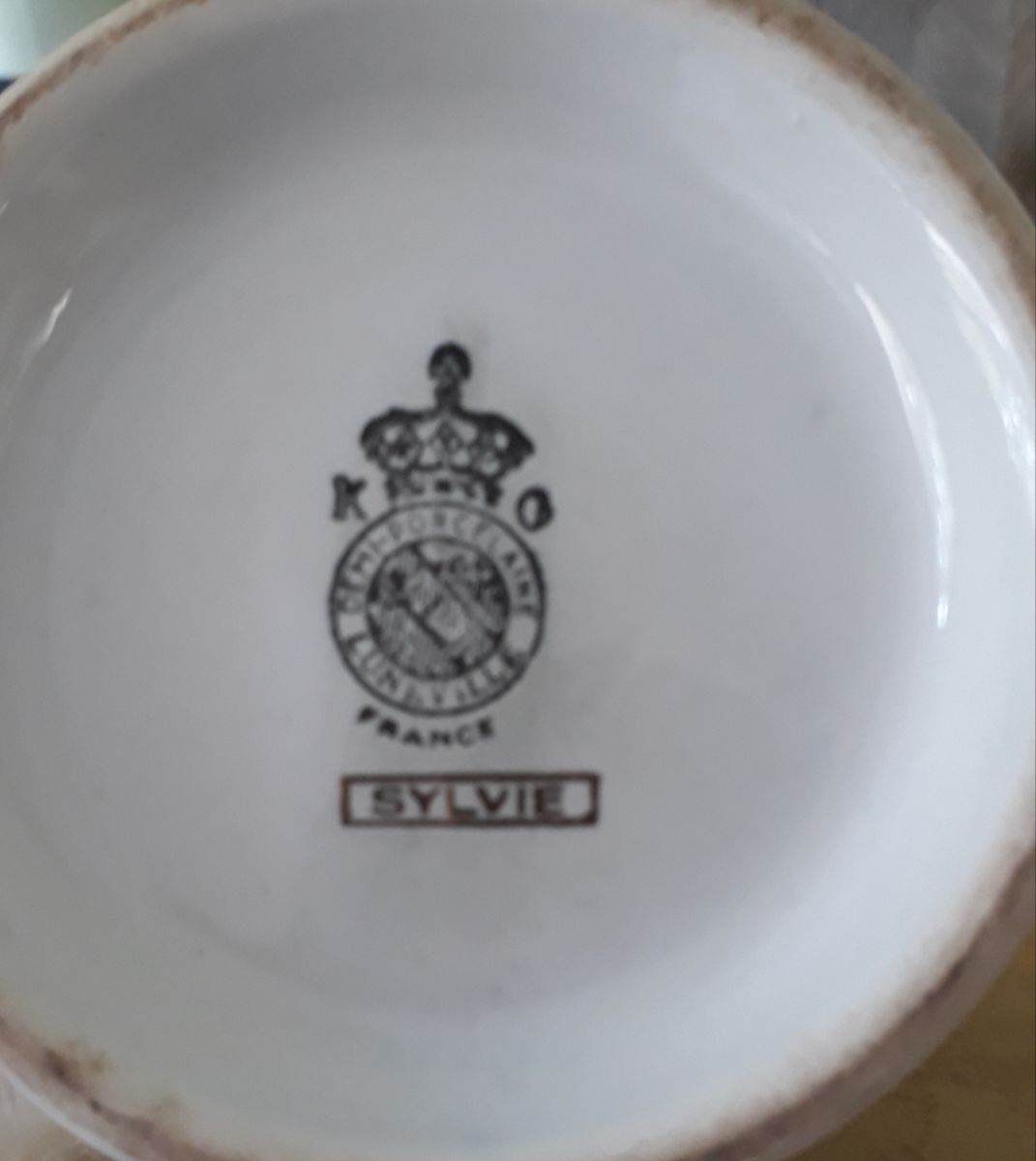 Superbe verseuse en Demi Porcelaine de Lunéville, modèle Sylvie, Fond blanc ,2 filets en bordure et étoiles or au centre.