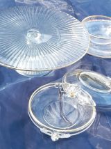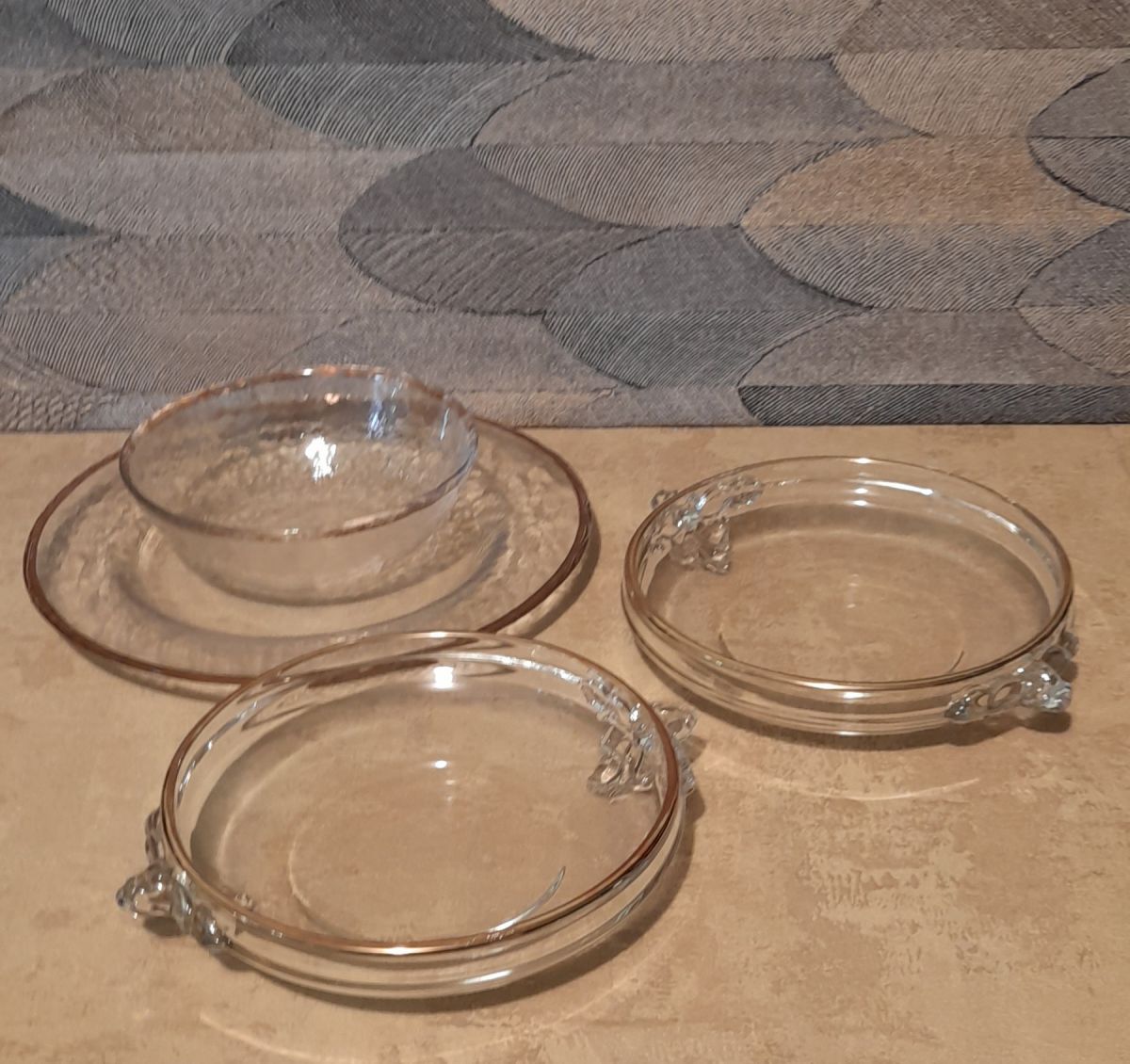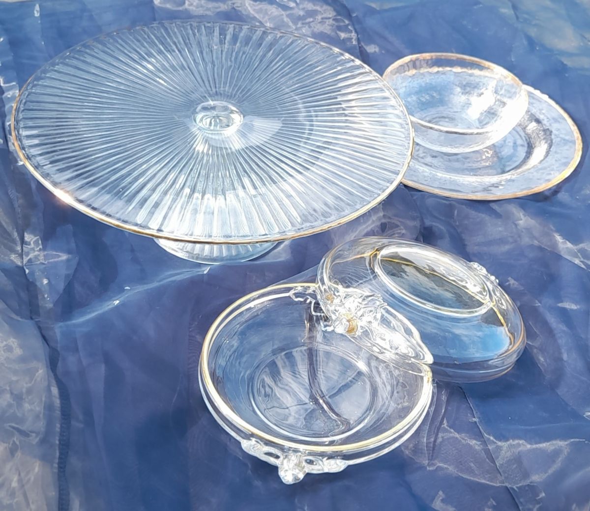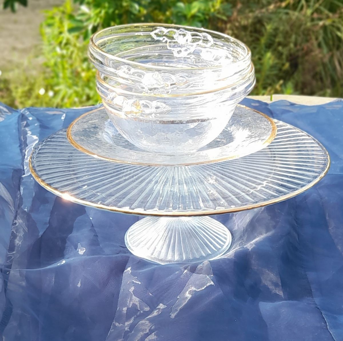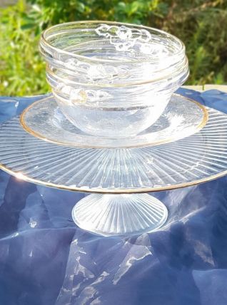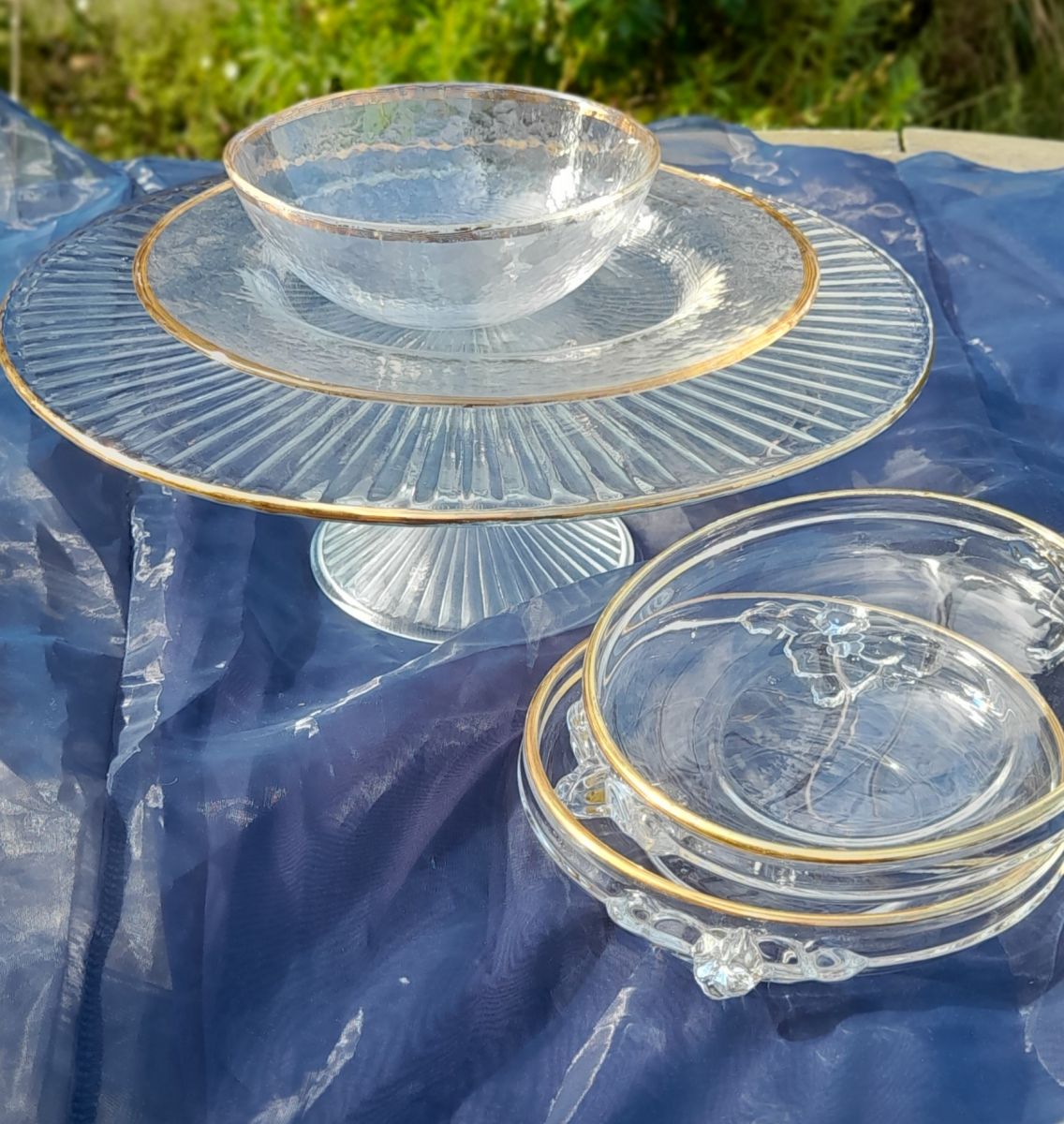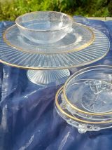 Ensemble dépareillé plat à tarte et coupelles verre et or, v