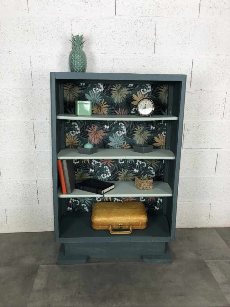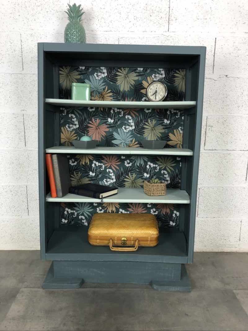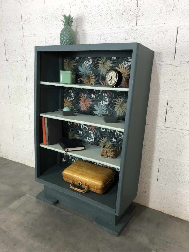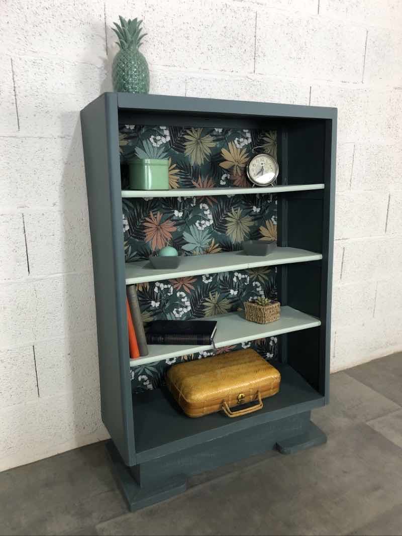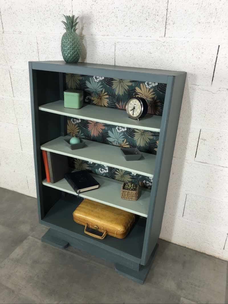 Bibus ou meuble étagères bibliothèque ancien en bois revisité bleu gris effet vieilli et vert clair pour les 3 étagères