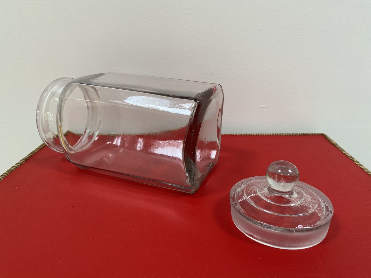 Beaucoup de charme vintage et parfait état de conservation pour ce grand pot style apothicaire avec bouchon en verre épais (quelques bulles).