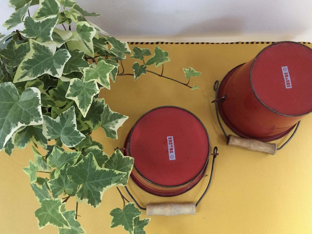 Beaucoup de charme pour ces petits seaux des années 70 en métal émaillé rouge qui peuvent servir de cache-pots, rangement petits accessoires, vide-poches, vases, déco cuisine, jeux d’enfant, etc.
