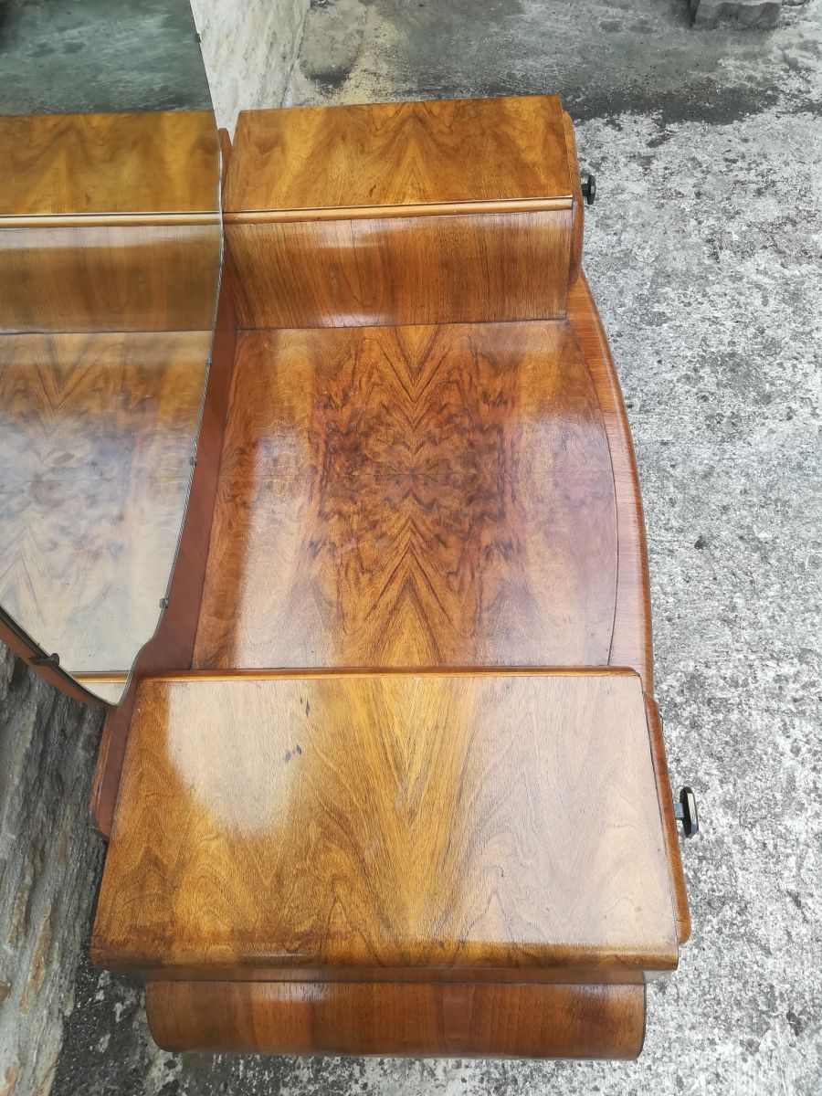 Coiffeuse art déco des années 30 en placage de noyer verni , quatre tiroirs , un miroir biseauté , en bon état , petites taches sur le plateau central , un morceau de placage a été rajouté sur la façade du grand tiroir voir la photo , le verni est en bon état , vous pouvez enlevé le miroir , le tout est solide , les tiroirs coulisses bien . Dimensions du tout L 121,5 cm x P 55 cm x H 145 cm ...Miroir : L 75,5 cm x H 76,5 cm ... Hauteur du bas sans le miroir 70 cm .