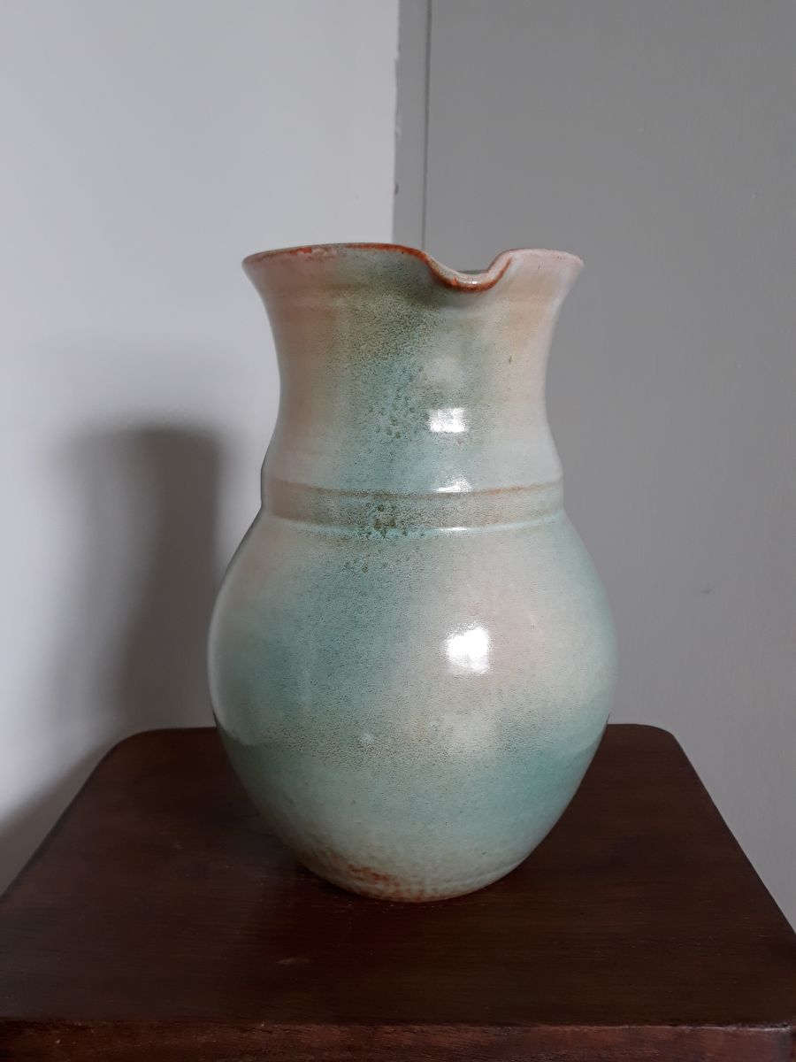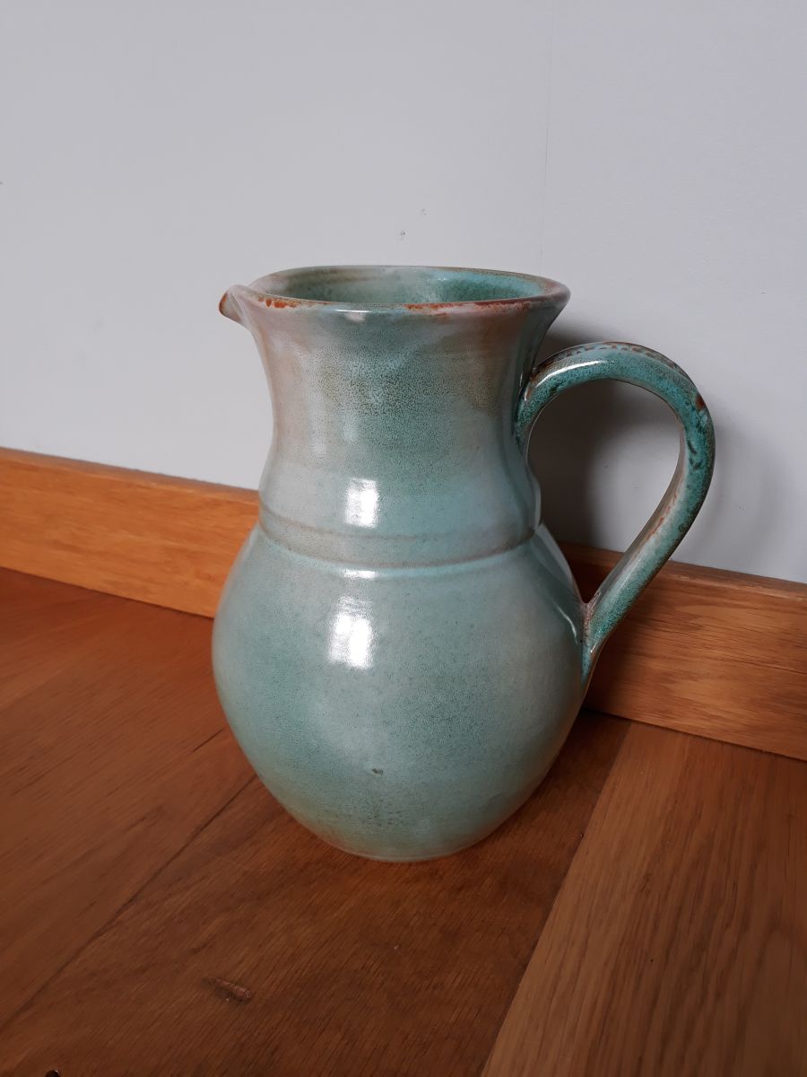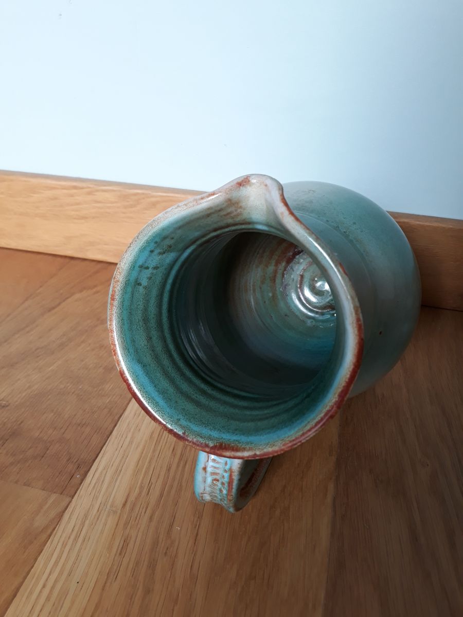 Très beau pichet en céramique émaillée de plusieurs teintes tournant autour du vert céladon et bleu turquoise avec quelques touches de caramel. Il accroche le regard, aucun doute, avec ses formes rondes et ses couleurs douces et apaisantes. Son anse comporte un joli décor en relief. Il est en bon état, juste deux tout petits éclats sur l'émaillage au niveau du pourtour de l'ouverture, mais qu'on distingue à peine, tant ils se fondent dans la couleur caramel. Et des taches (de calcaire je pense) à l'intérieur, difficiles à nettoyer, à utiliser pour un usage décoratif plutôt qu'alimentaire. Il mesure 21 cm de hauteur pour un diamètre d'environ 14 cm au plus large, et une largeur maximale de 18 cm environ avec l'anse. Il pèse 1 kg.