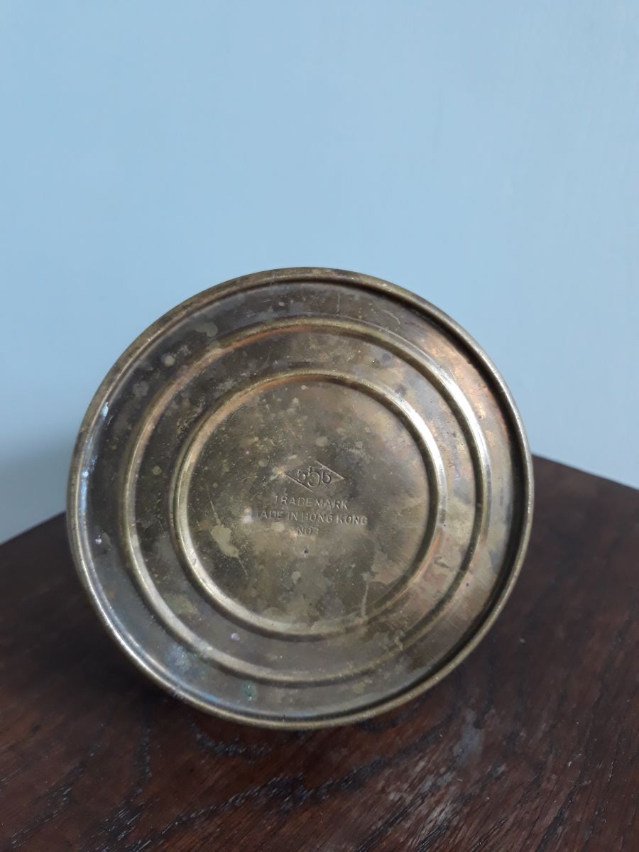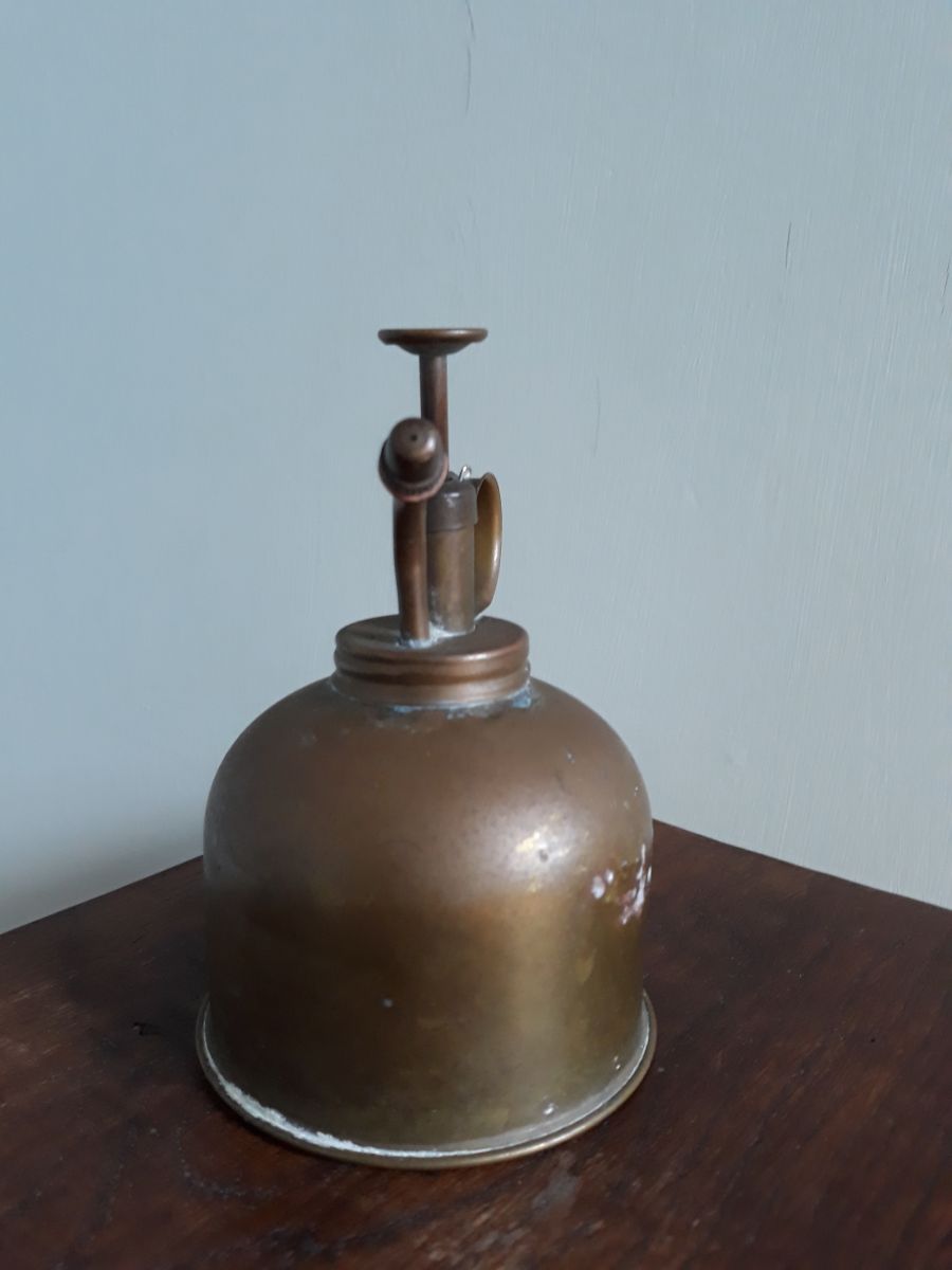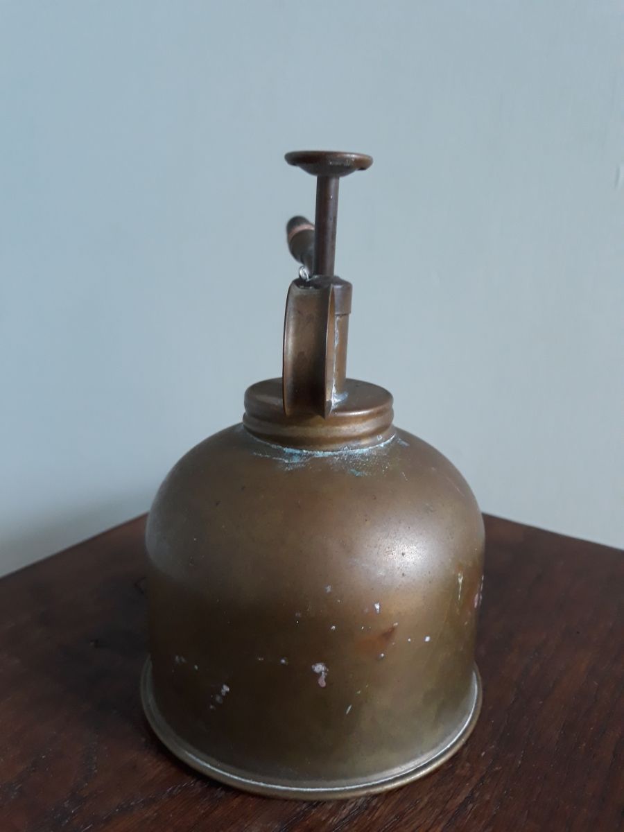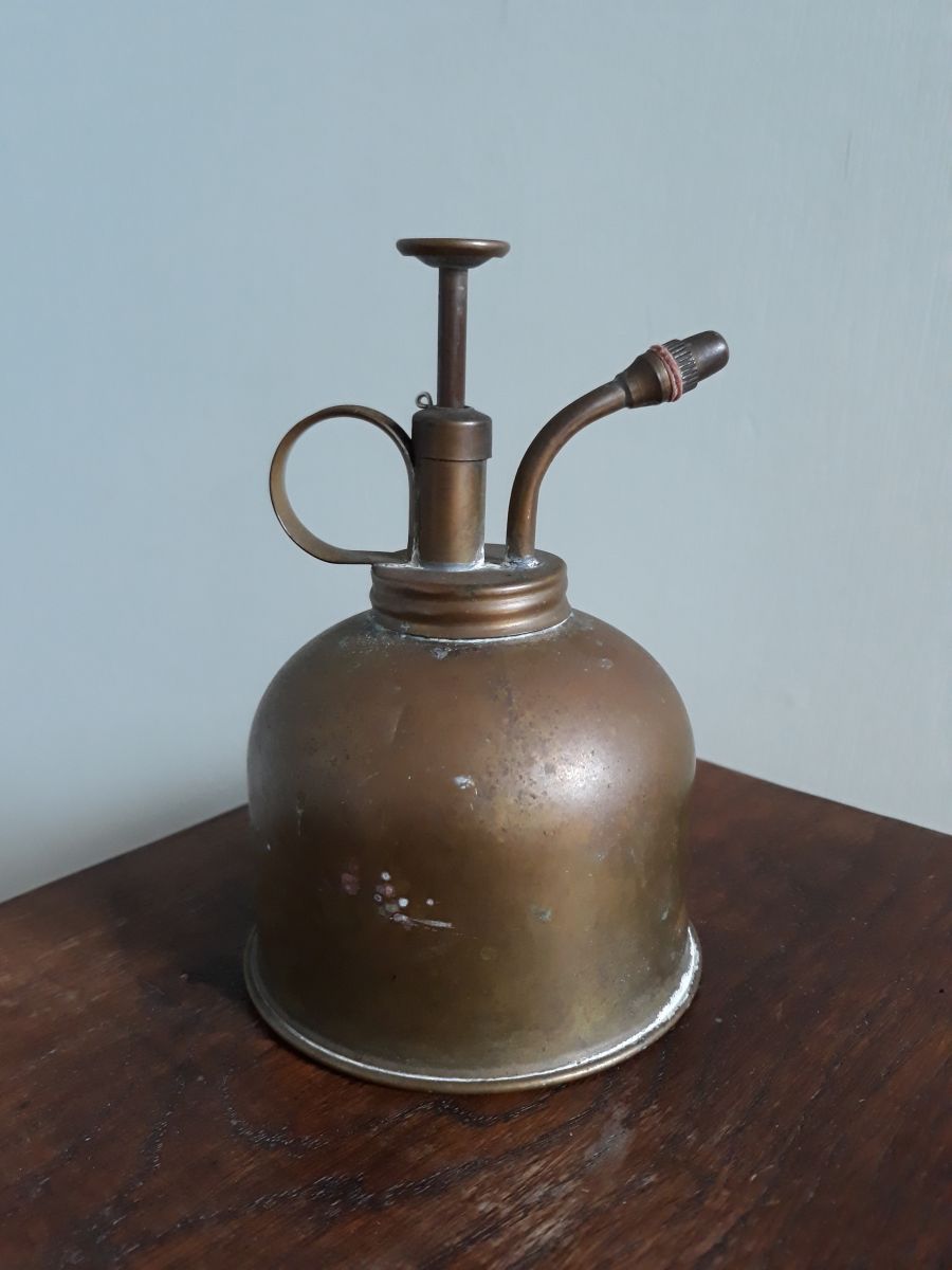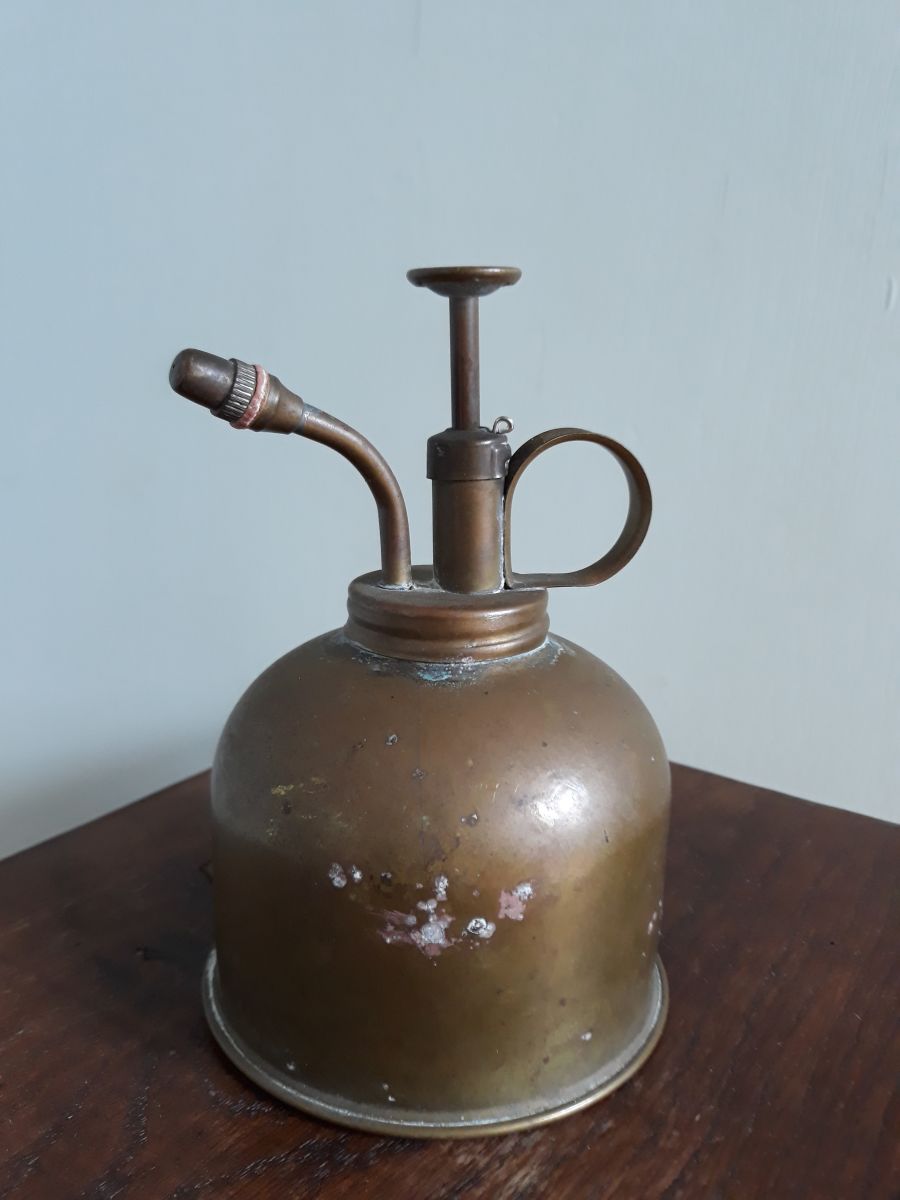 Joli vaporisateur pour plantes, en métal, du cuivre peut-être, avec une belle patine ancienne. Je ne sais pas s'il fonctionne, car je n'arrive pas à ouvrir le réservoir (la corrosion a du faire son œuvre), mais son côté décoratif est indéniable. Dessous un marquage en creux « 555 trademark made in Hong Kong ». Il ne cache pas son âge : petites touches de corrosion bleue et pleins de petites marques diverses, mais pas de gros enfoncement. Il mesure 15 cm de haut (piston relevé), pour un diamètre de la base de 8, 5 cm. Il pèse 120 g.