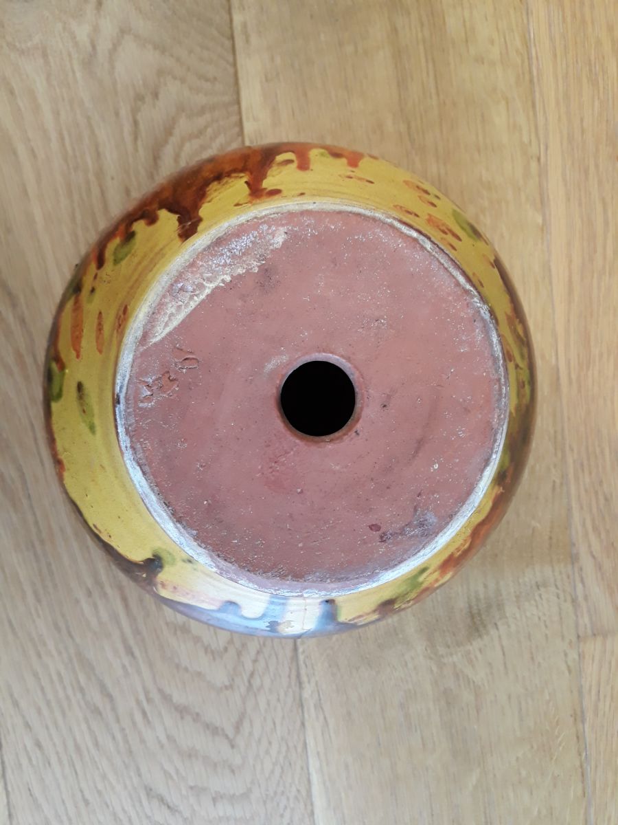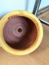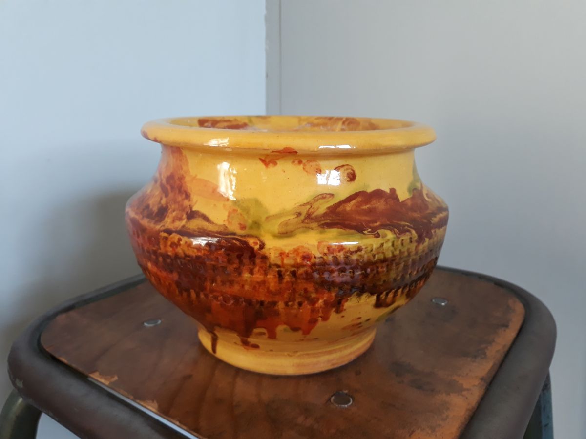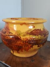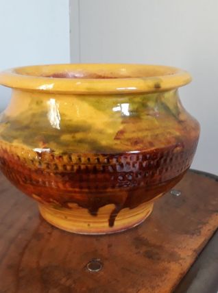 Pot en terre cuite émaillée, beau et original, avec sa forme harmonieuse entourée d'une large bande « poinçonnée » en relief, et un émaillage qui évoque les couleurs de l'automne : jaune moutarde, brun chocolat, et quelques touches de vert olive et d'orange ! Il est si beau qu'il peut même se suffire à lui même, seul sur une étagère, sans les plantes qu'il est censé contenir. Il pourrait dater des années 40 mais sans certitude. Il est en très bel état, juste un peu d'usure sur le bord de la base. Il est percé d'un trou pour évacuer l'eau en trop. Il mesure 13 cm de hauteur, et environ 19 cm de diamètre maximal. Il pèse 1, 2 kg.