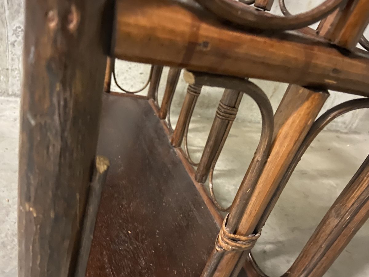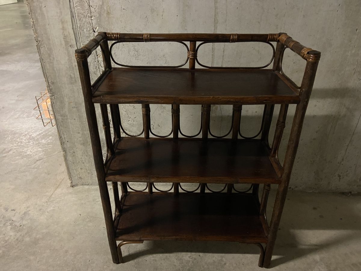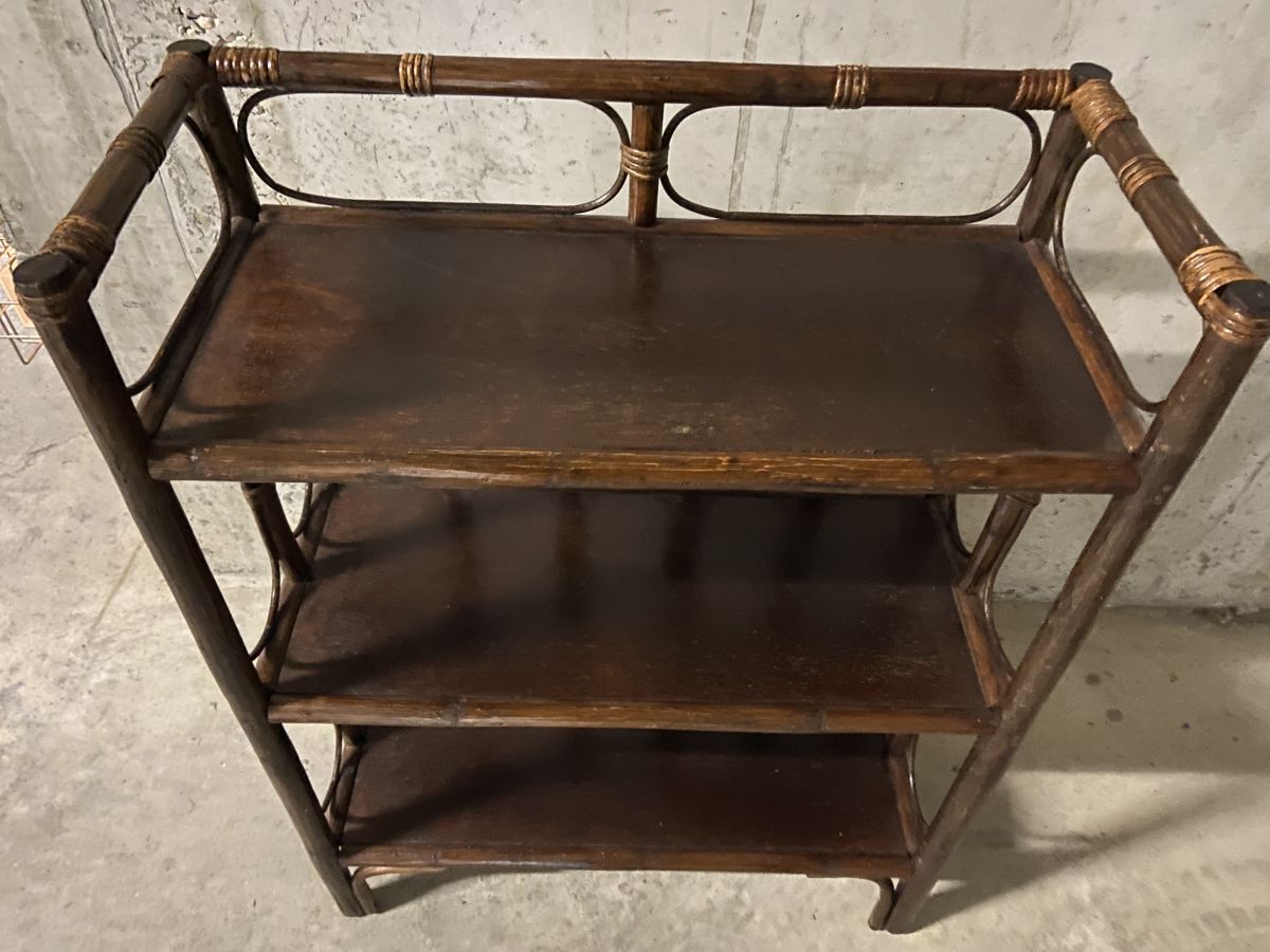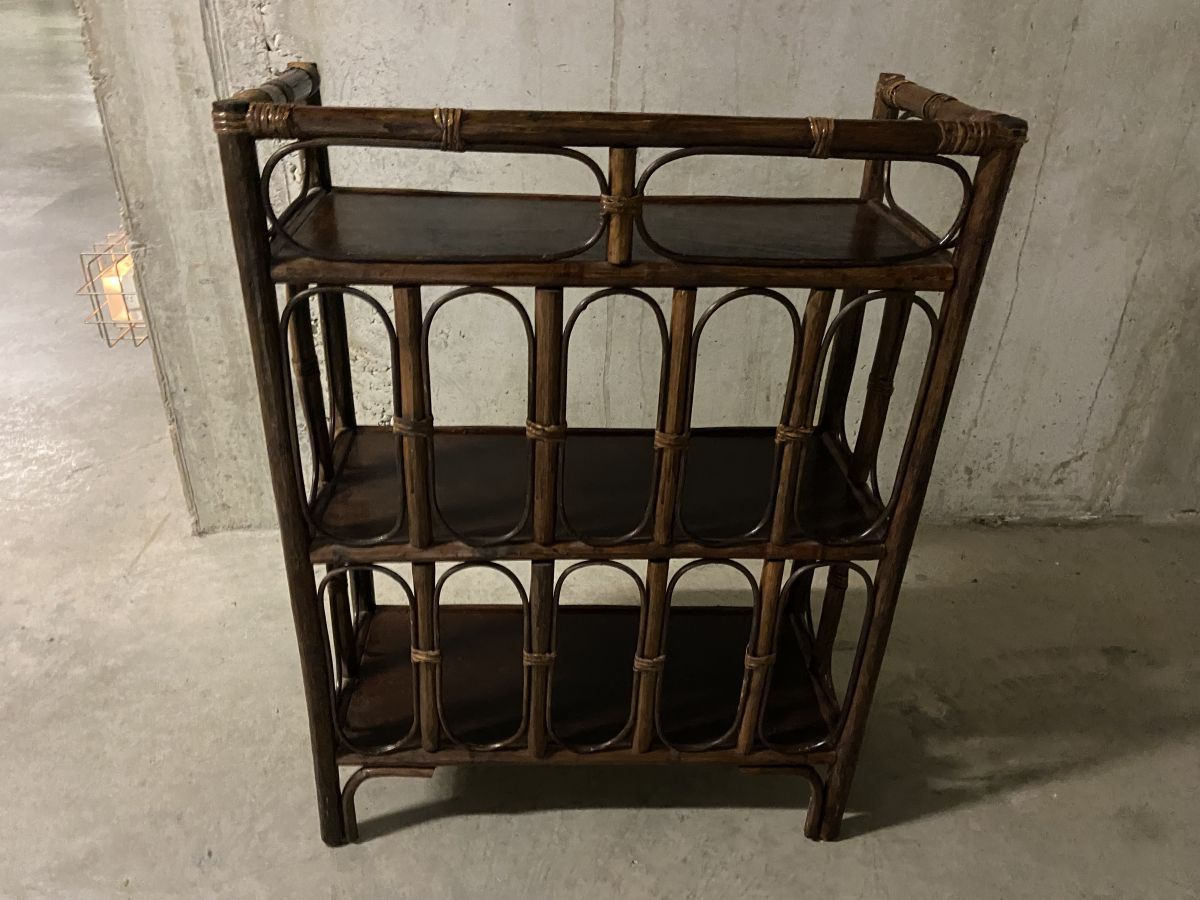 Etagère en rotin des années 70, 3 plateaux, quelques manques de vernis, un brin cassé sur le bas de l’étagère (voir photos), dimensions (cm) : L.66xH.89xP.29.