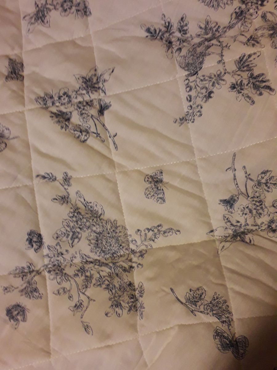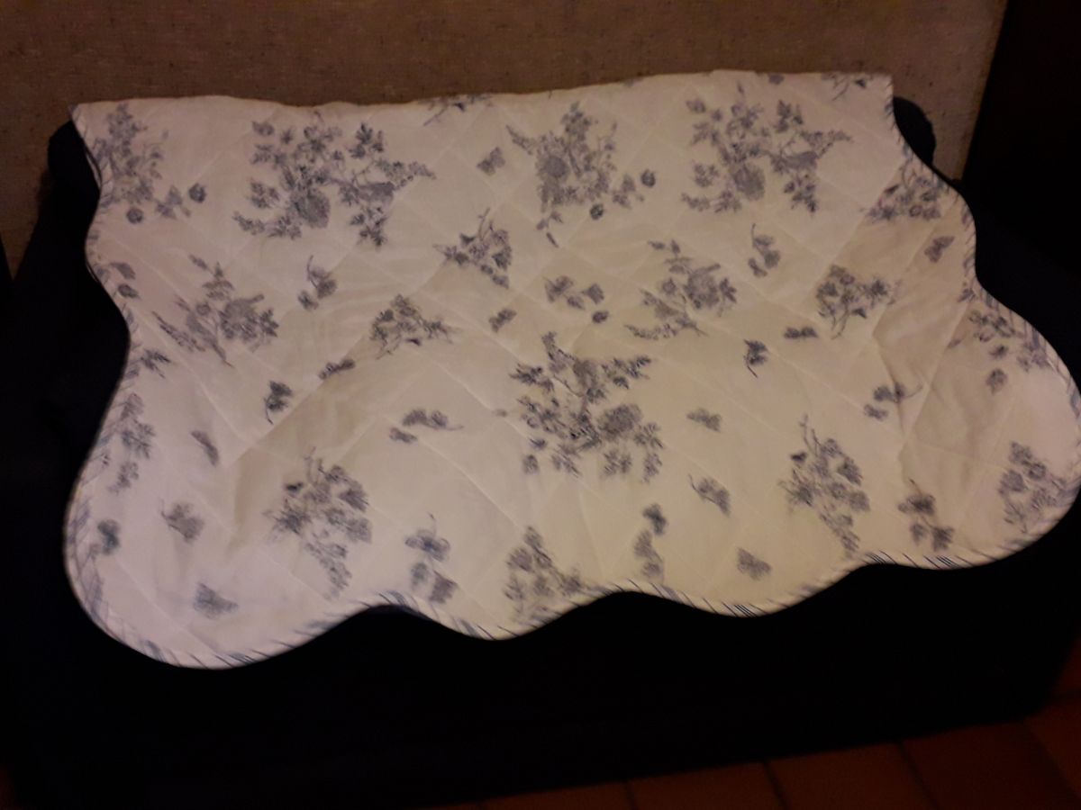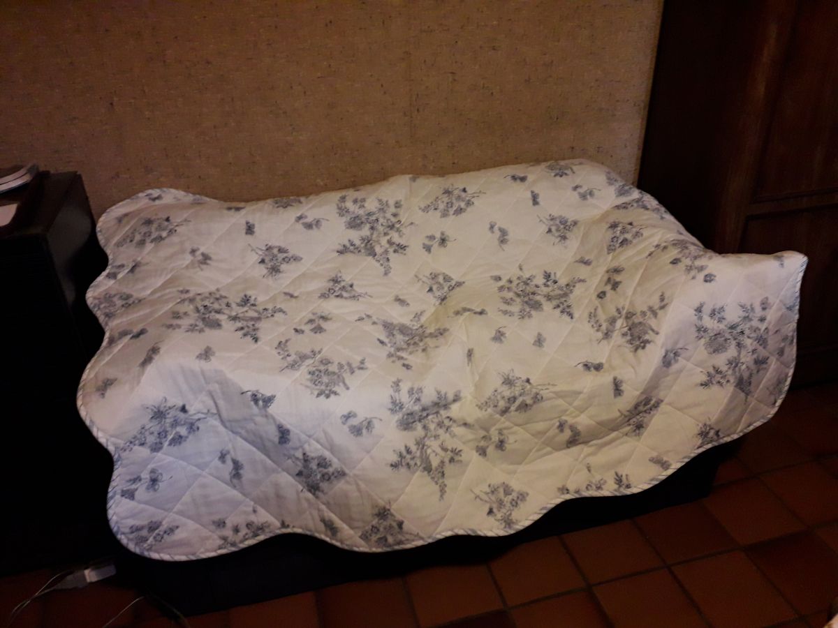 Très joli dessus de lit 1 place, ancien, Damart, polyester et coton. Beaux motifs bleus fleuris sur fond blanc, contours en forme de vaguelettes, matière très douce au toucher.