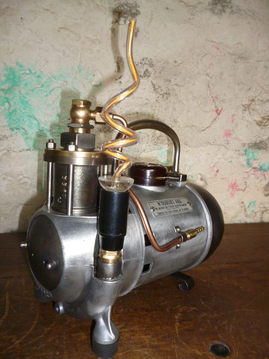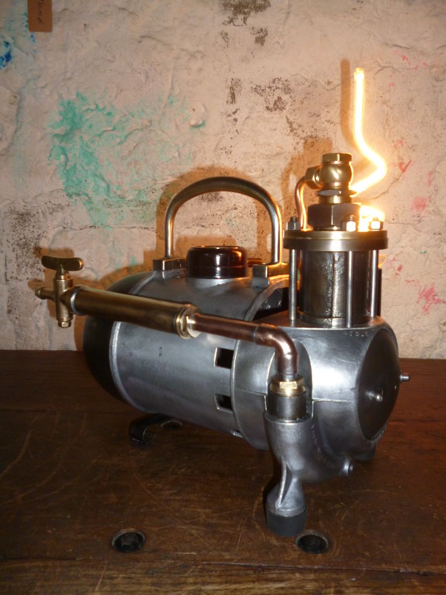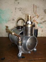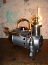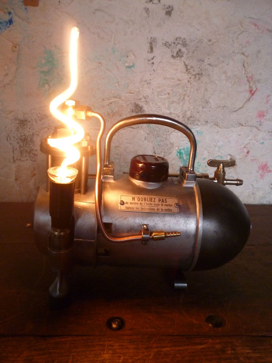 Lampe design industriel realisee a partir d'un ancien compresseur portable de garage des annees circa 1960 . " ETS LUCHARD PARIS - MADE IN FRANCE " .