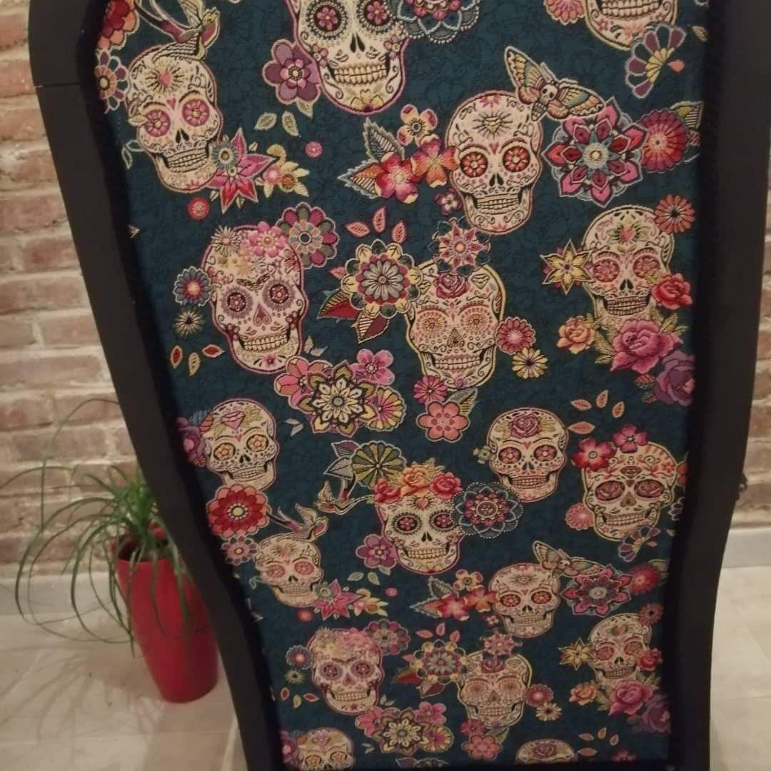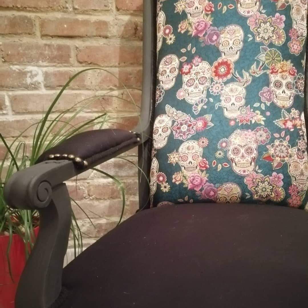 Fauteuil voltaire entièrement rénové, tissus têtes de mort pour le dossier, et noir pour l assise et les accoudoirs. Clous tapissiers. Piètement noir mat patiné. Très belle pièce unique.