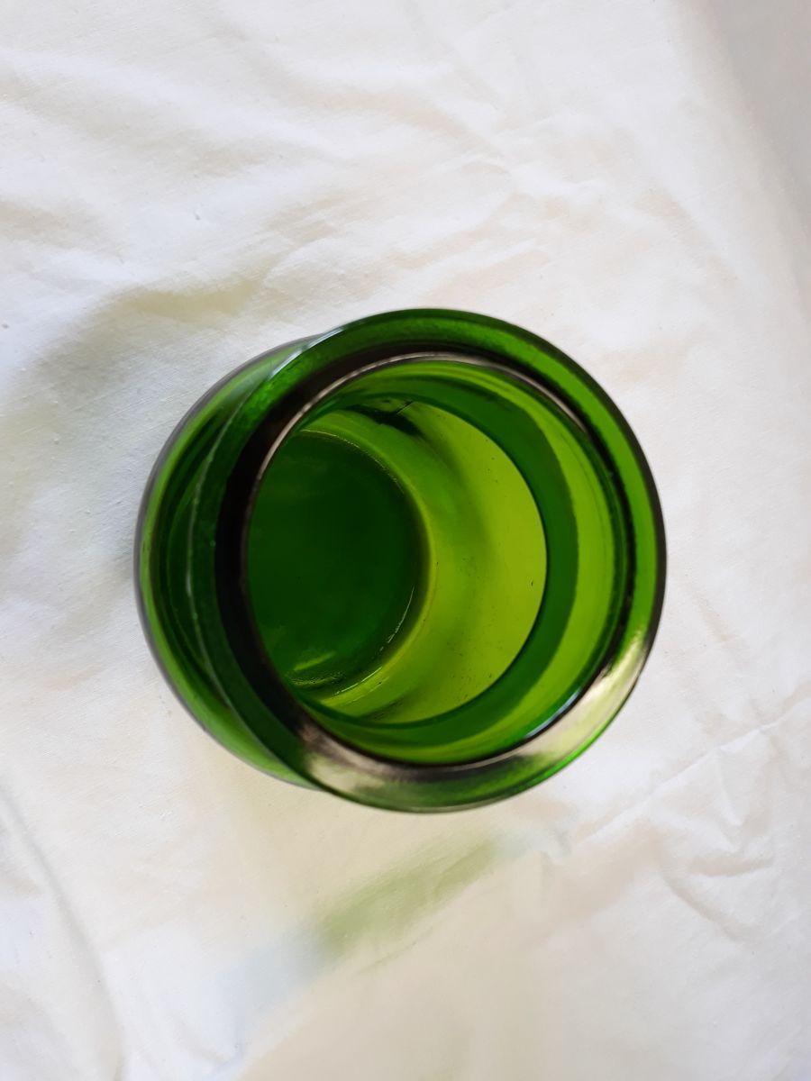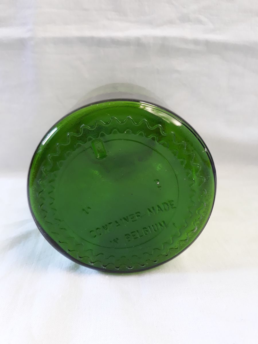Joli flacon en verre moulé épais d'une belle couleur verte qui reflète joliment la lumière. Dessous, on peut lire en relief « container made in Belgium ». Il est en bon état général, ni fêle ni éclat mais quelques traces du temps : petites rayures et marques et des traces de calcaire au fond. Il mesure 16, 5 cm de haut, 8 cm de diamètre au goulot, 10 cm de diamètre pour le corps et pèse environ 550 g.