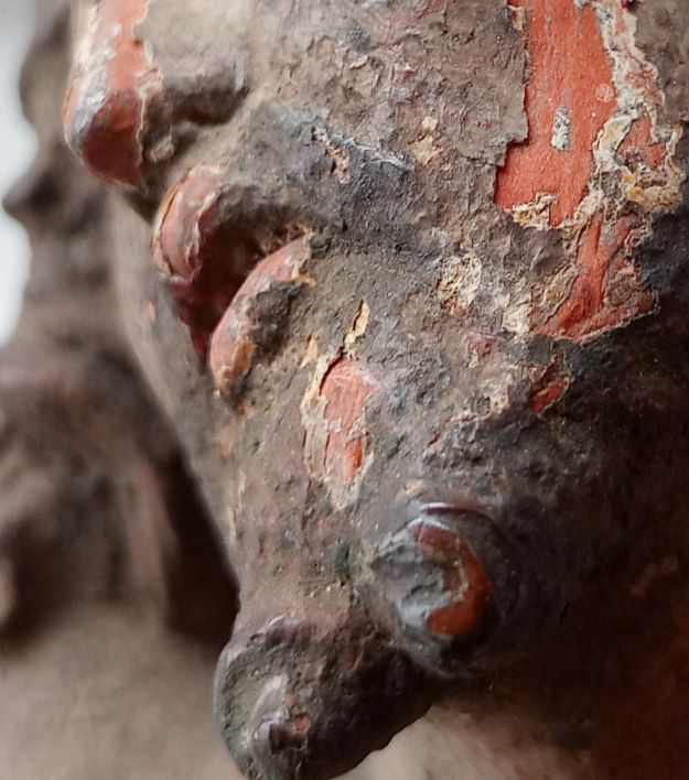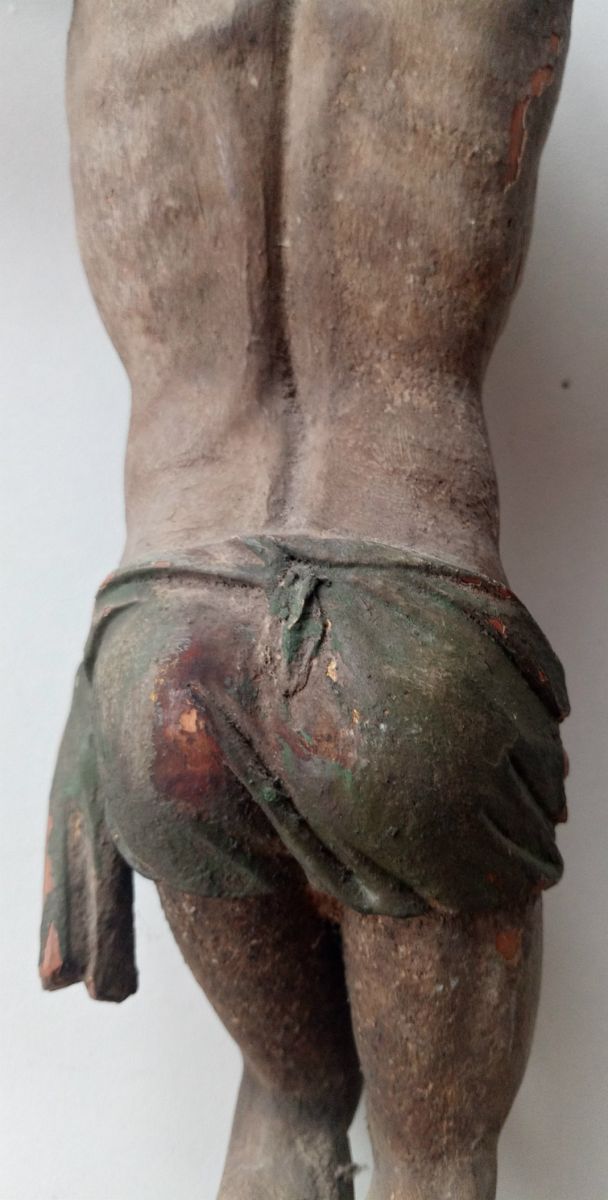 Tres beau christ en croix du XVIIe siecle, bois fruitier, polychrome, tres finement sculpte, dents apparentes. Expertise a 1200 euros. En bon etat, mais des usures sur le visage et sur les bras ce qui est normal vu son age.