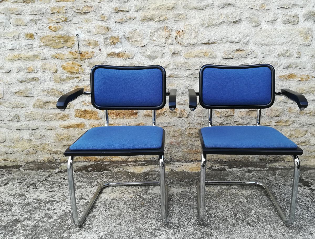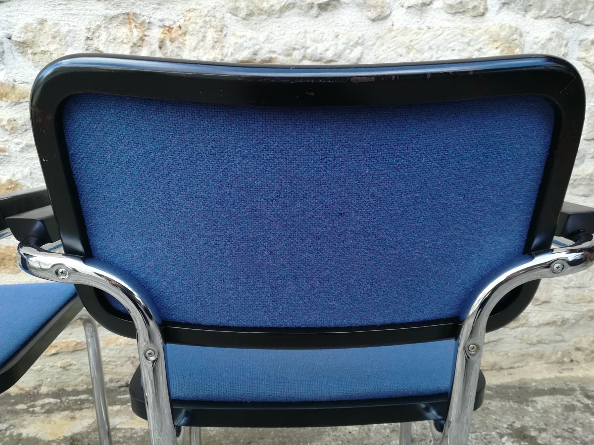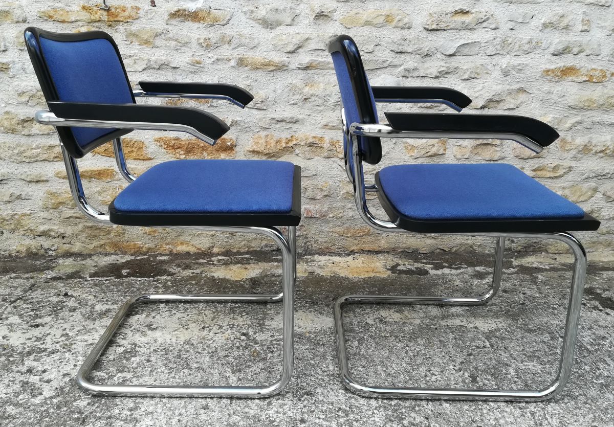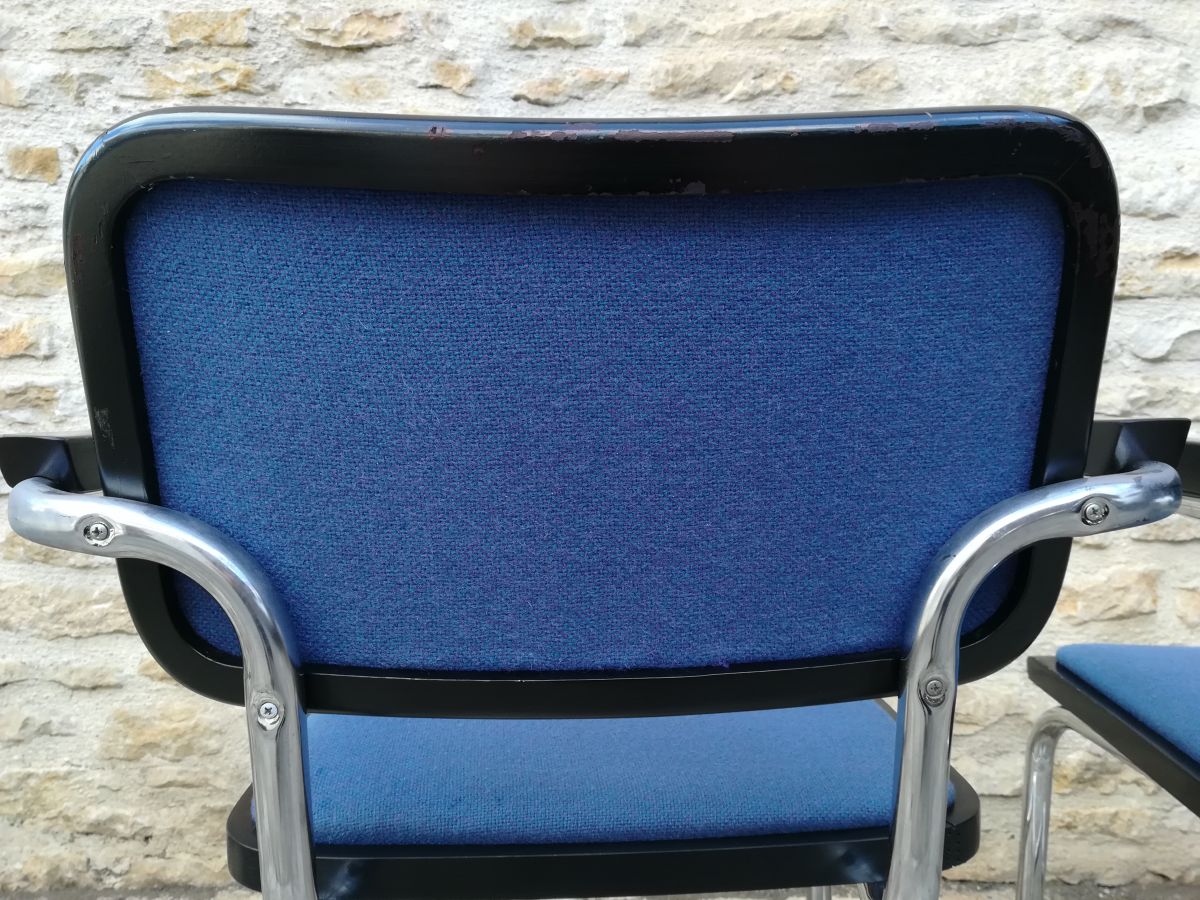Pair de fauteuils de Marcel Breuer marqué sous les assises Made In Italy , en bois laqué noir , tissu bleu et structure en acier chromé . Le tout est en bon état , quelques frottement et manque de laque sur les dos des deux dossiers voir les photos . Le tissu est en bon état , pas d'accroc ou de tache . Pas de rouille ou de piqûre sur le chrome . Dimensions : H 80 cm x L59,5 cm x P 56 cm ...Hauteur assise 46 cm .
