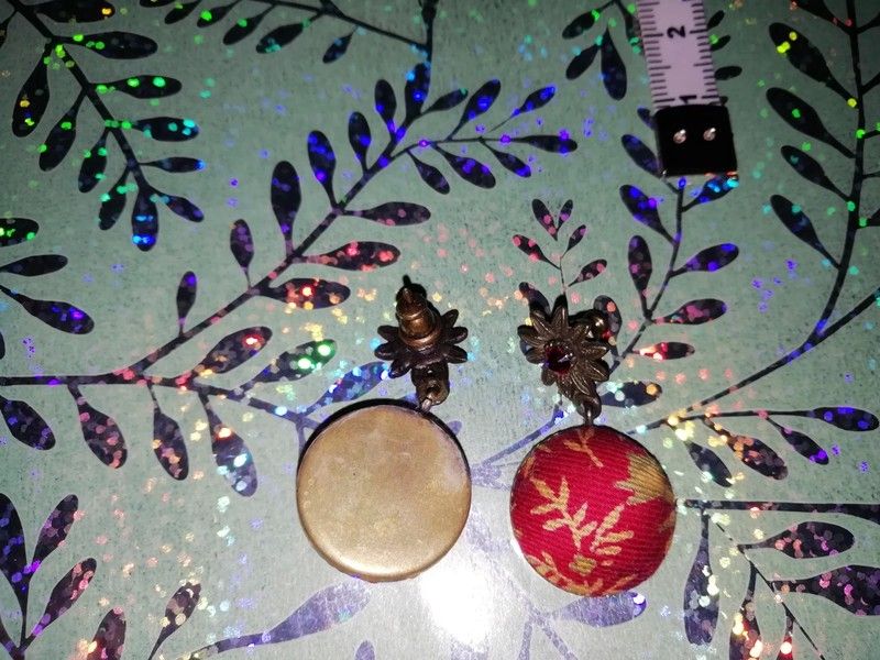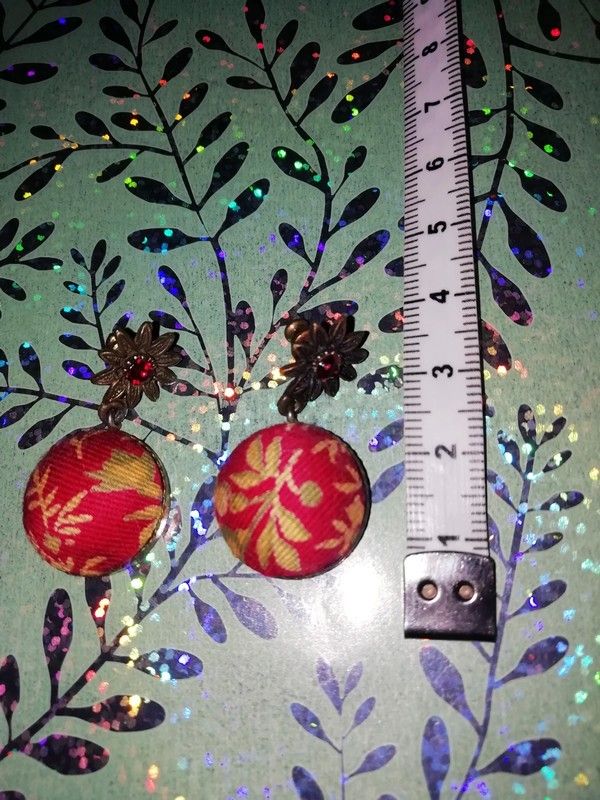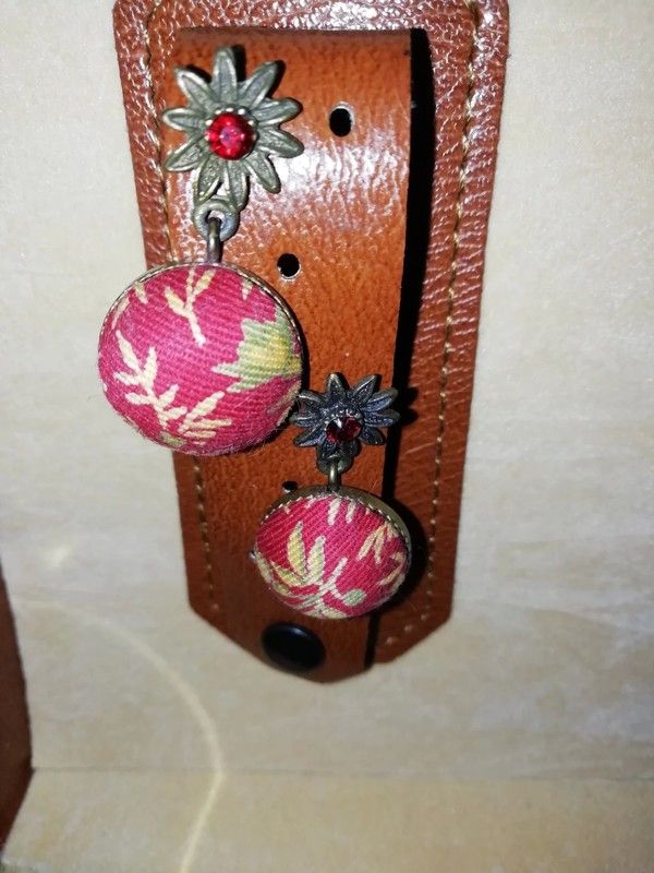 Boucles d'oreilles pour oreilles percées, métal laiton et tissu dans les tons rouge/bordeaux.