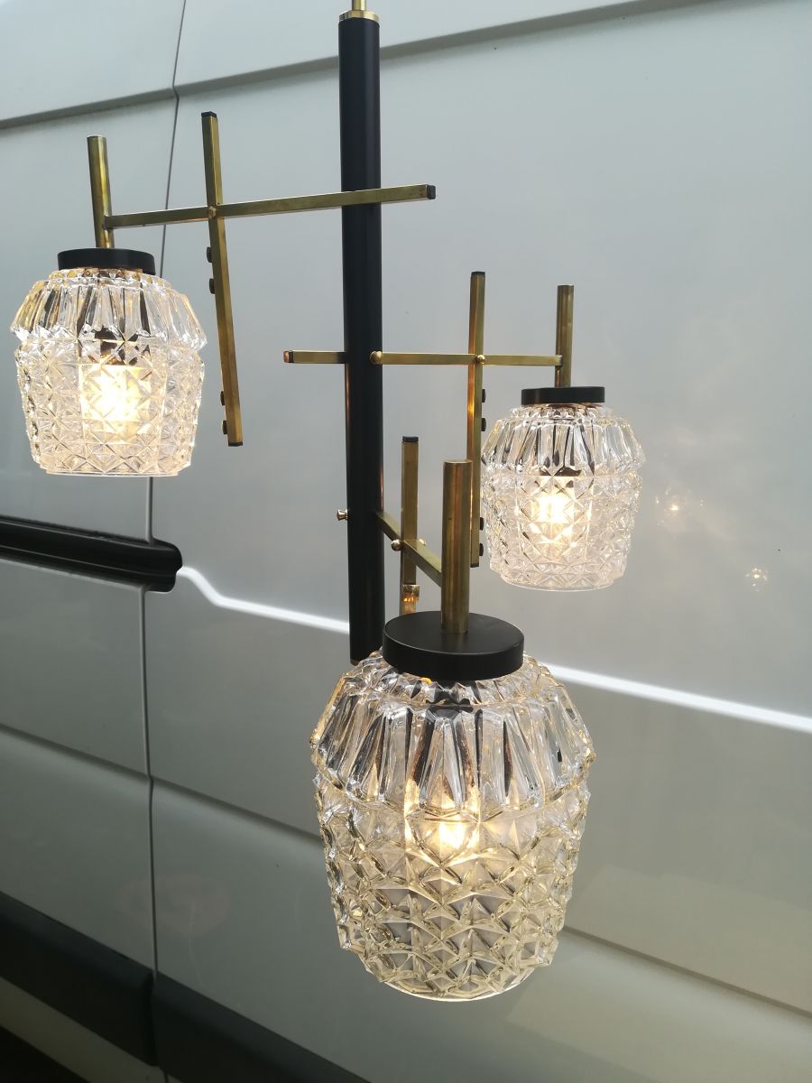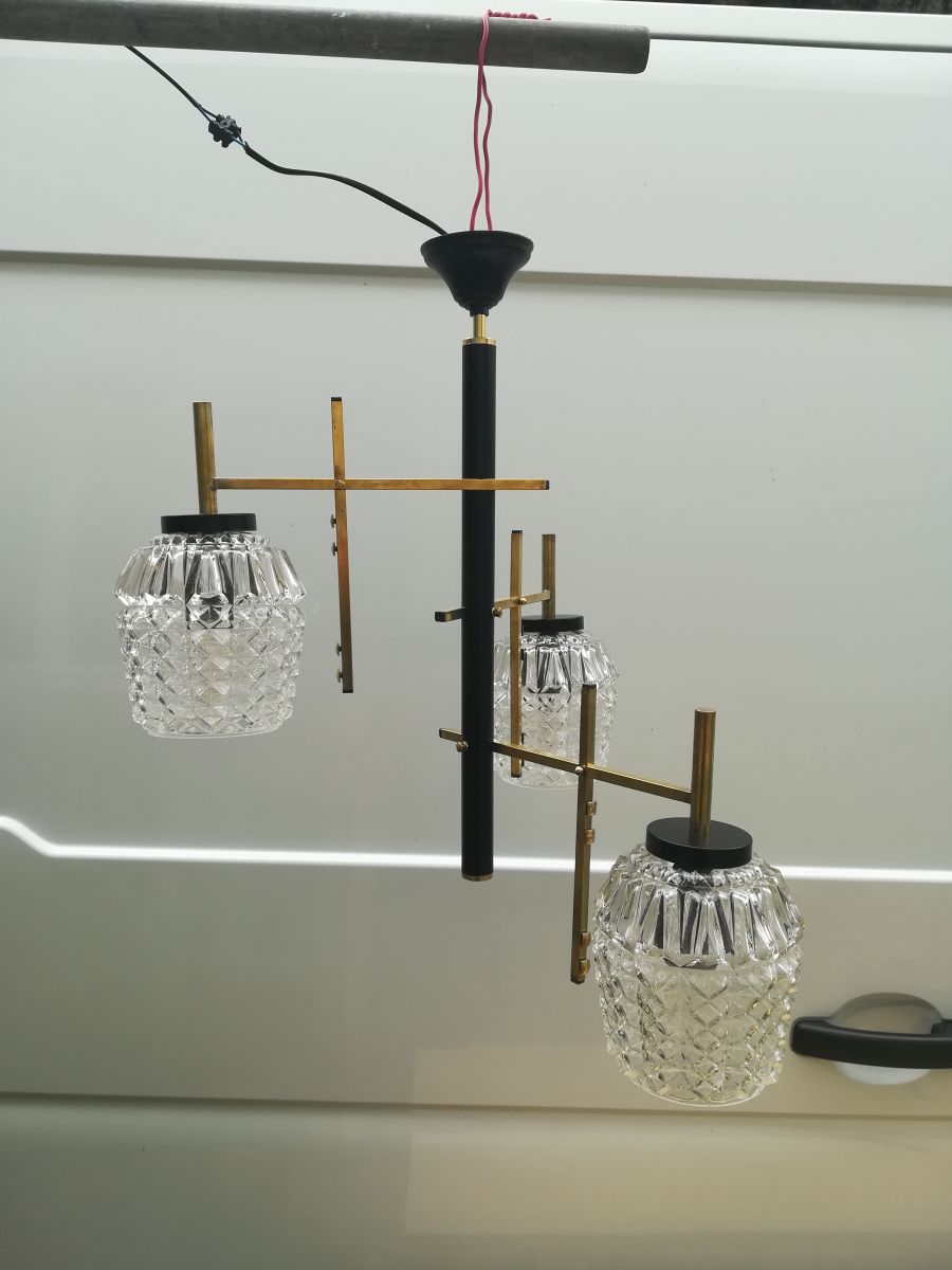 Lustre Arlus des années 50/60 en laiton , métal laqué noir et trois globes en verre , en bon état .L'électricité est neuve , trois douilles neuve a vis E14 , vendu sans les ampoules , vous pouvez l'utilisé sans les globes voir la photo . Il manque deux écrou tète boules en laiton , je les ai remplacer par deux écrous plat en laiton .Dimensions: h 57 cm x Diamètre 50 cm ...Verrerie : Diamètre 12 cm x H 15 cm .