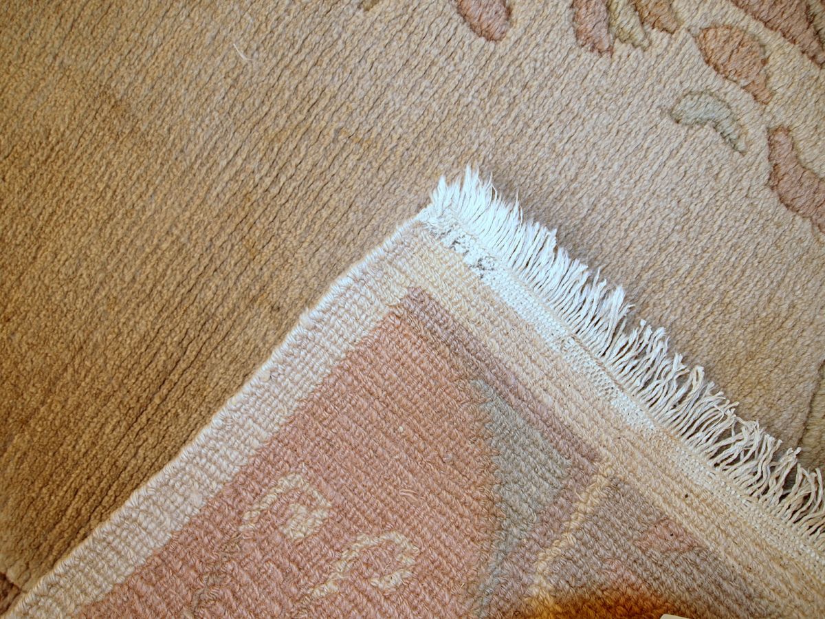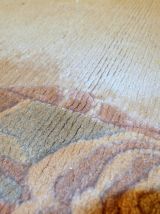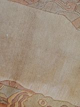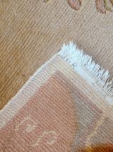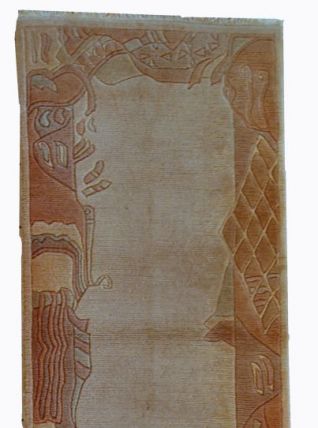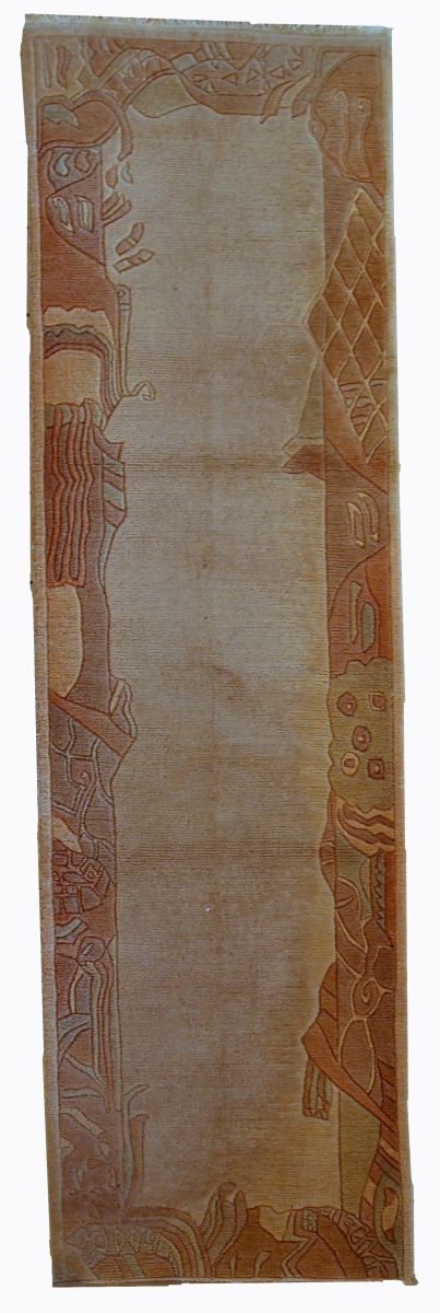 Vintage Tibetan runner from Nepal in original good condition. All-over design in beige colour with decorative border in pastel shades of peach and purple. The pile on this rug is thick and soft.
