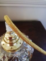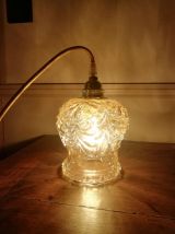 Lampe baladeuse, verre de couleur dorée, avec des motifs en relief. Douille E27, serre câble transparent, prise et interrupteur bipolaire transparents, avec cordon de 2m rond, pailleté doré. Electrification neuve. Hauteur du verre 14 cm. Peut se poser sur un meuble ou se suspendre au mur grâce à une équerre ou crochet. Vendue sans ampoule.