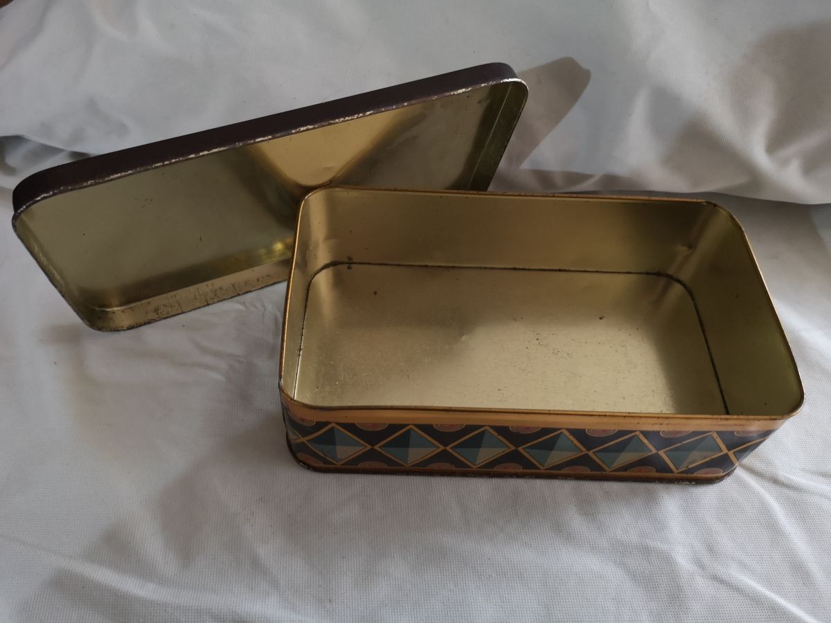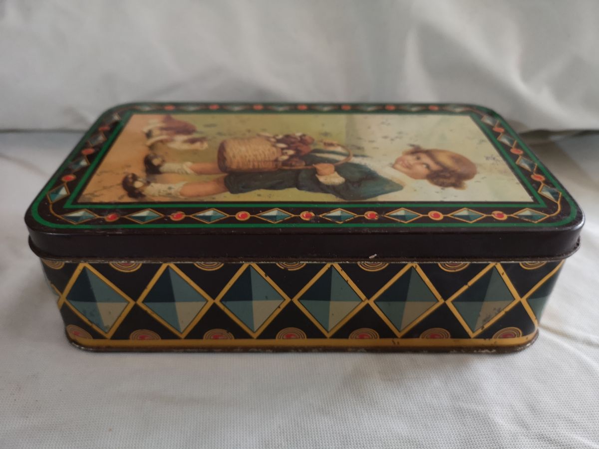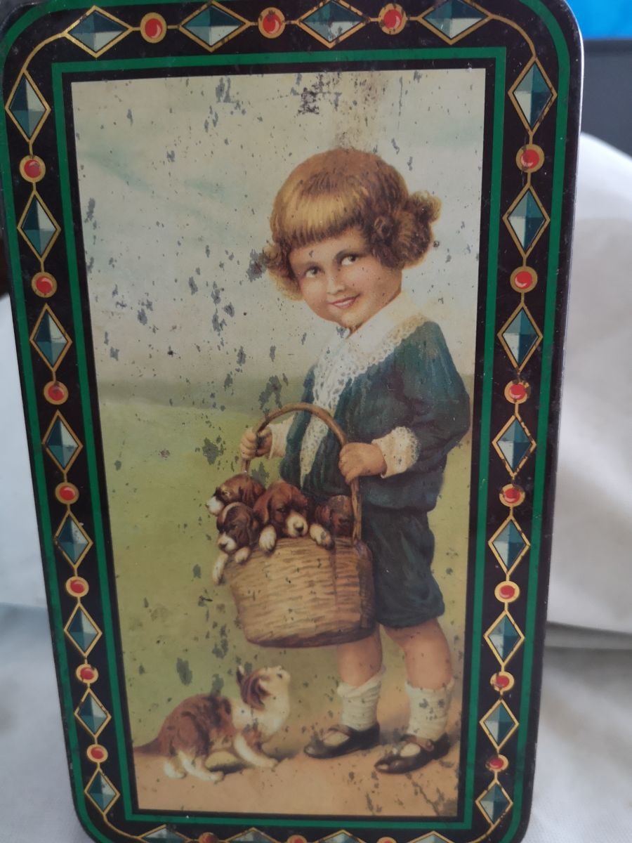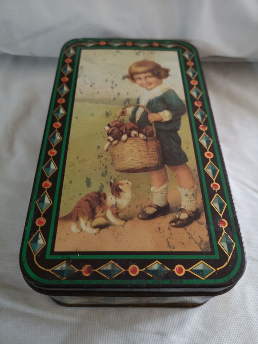 boite metal tres ancienne enfant chat et chien serigraphie
