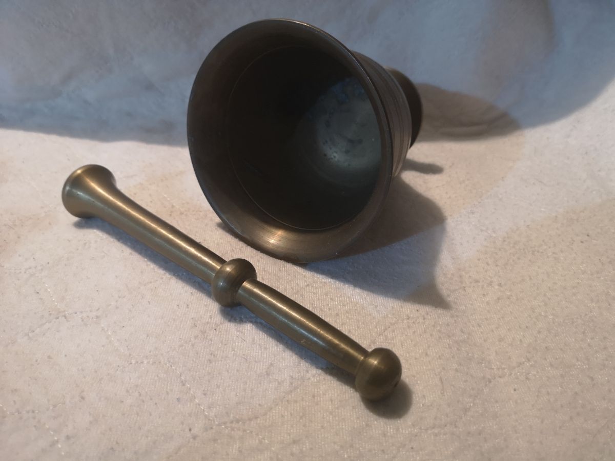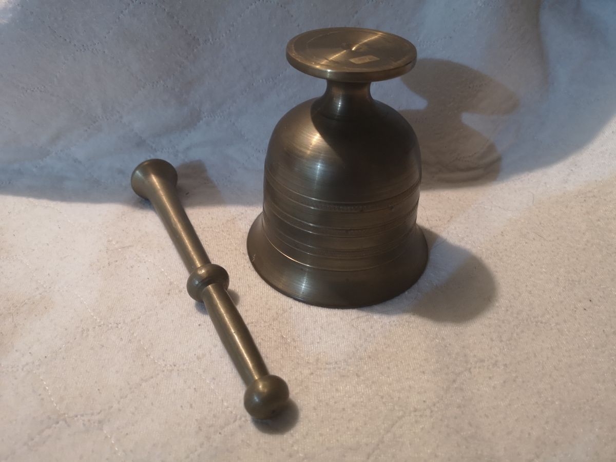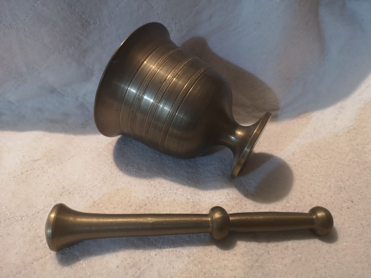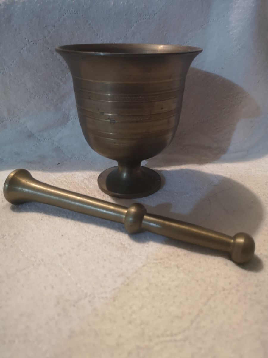 Mortier en bronze avec pilon en bronze mortier 11,5 cm de hauteur largeur 10,5 poids environ un bon kilo et le pilon 18 cm de long prix bradé