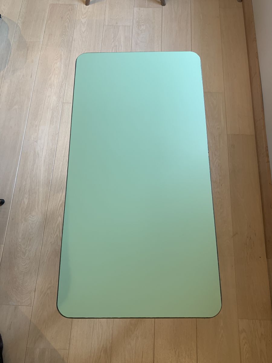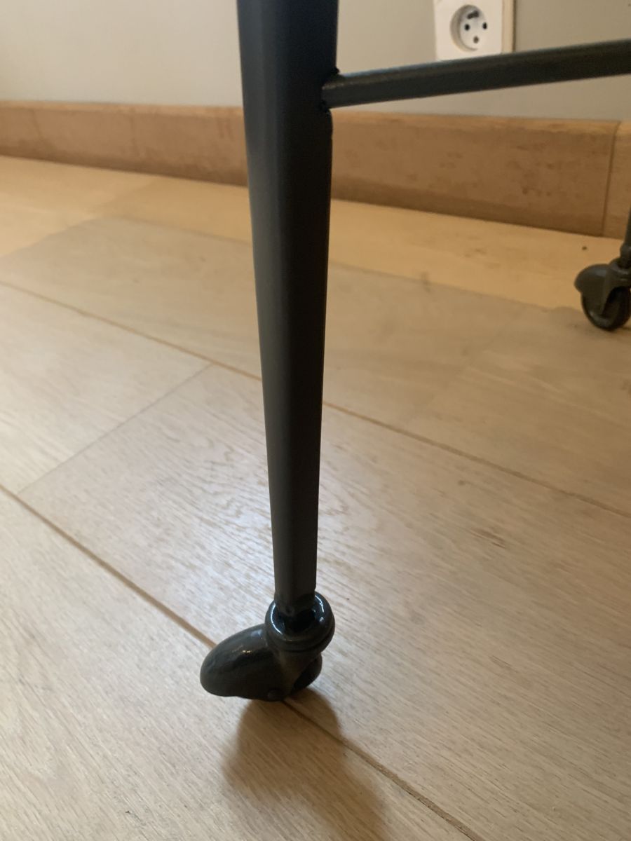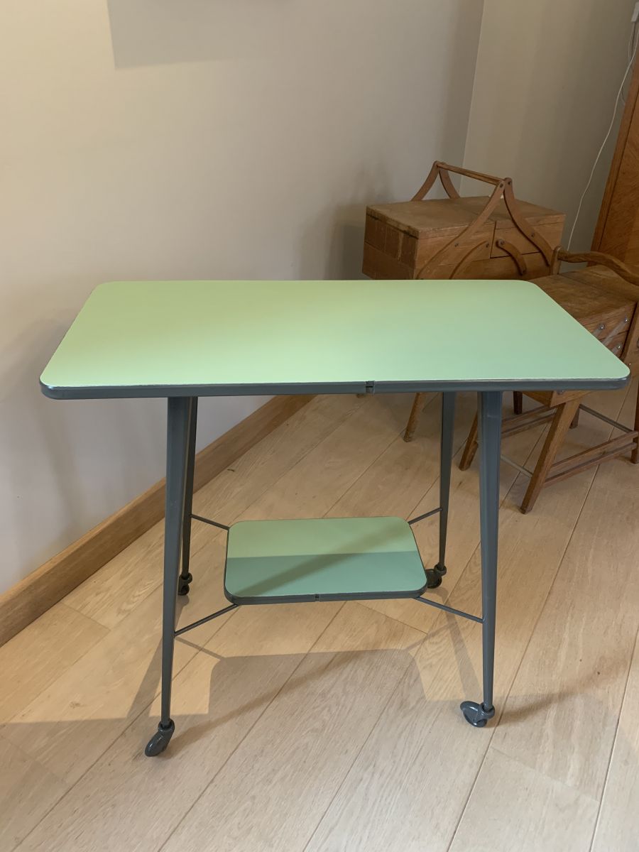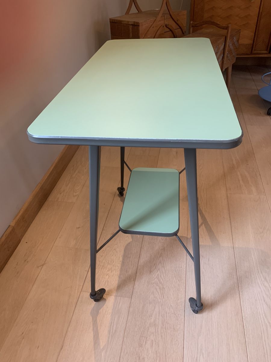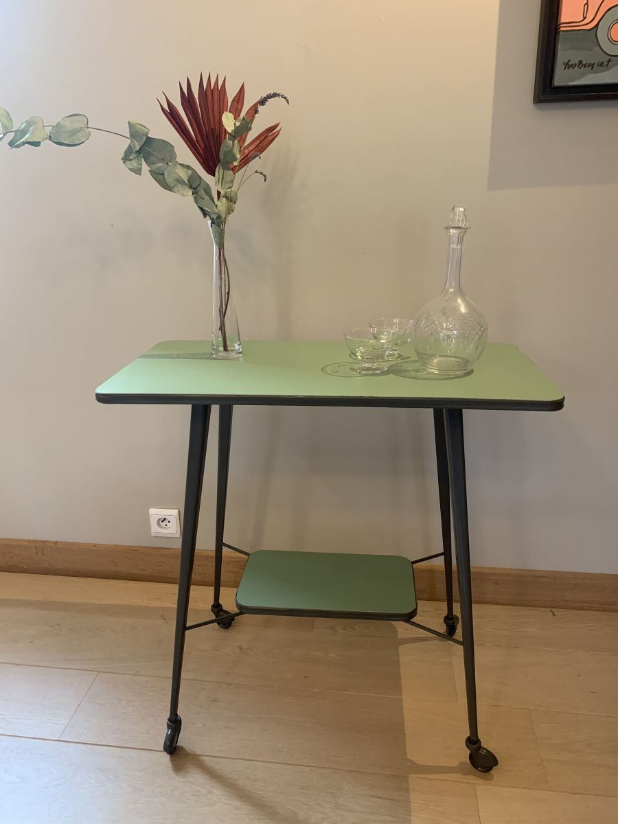 Desserte roulante en bois et métal , relookee en vert eucalyptus pour les plateaux et gris terre d’ombre pour les pieds