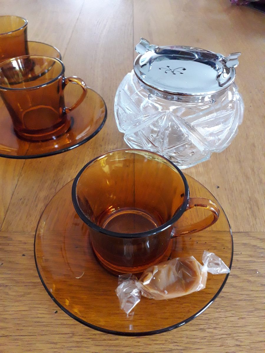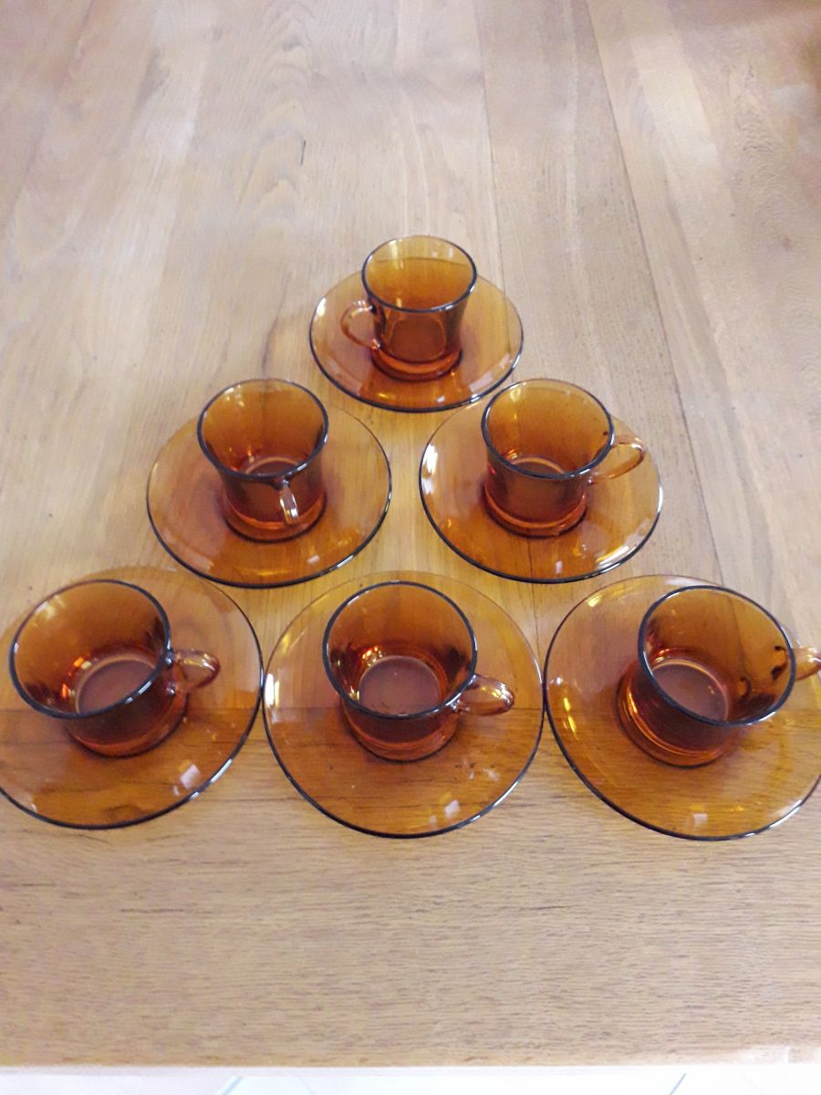 Touche délicatement vintage avec cette série de 6 tasses et sous tasses en verre trempé. De la célèbre marque française DURALEX , d'une belle couleur ambrée, en excellent état malgré les années.