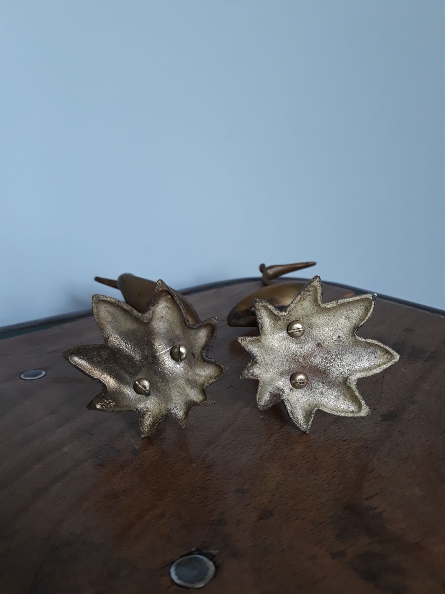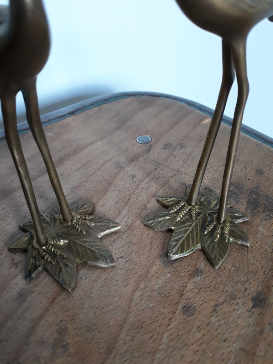 Joli couple d'échassiers en laiton, des hérons il me semble, datant probablement des années 60 ou 70, avec un contraste surprenant entre les corps stylisés aux lignes simples et les détails en relief sur les ailes et les bases. Le laiton, doré et brillant à l'origine, a pris une jolie patine avec les années. La base représente une feuille avec des nervures en relief. Ils sont en bon état général mais ne cachent pas leur âge : quelques points de corrosion bleue, quelques petites taches. Ils font 20 cm et 17 cm de hauteur. Leurs bases mesurent environ 5, 5 cm sur 6 cm. L'ensemble pèse 240 g.