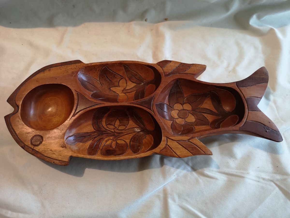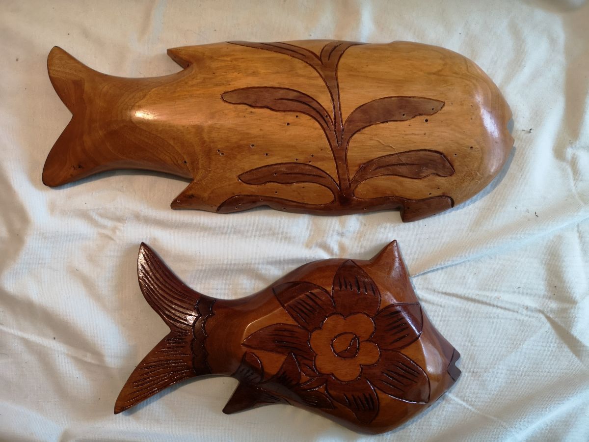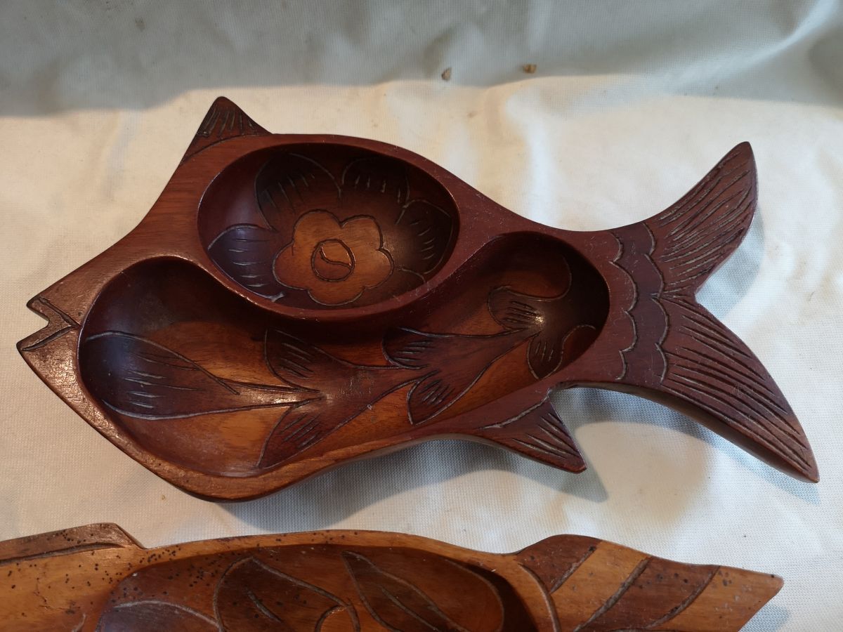 2 plateaux poissons en bois sculptés pour présentation d'amuses-Gueules lors de fetes réceptions repas en famille etc .. 42 cm de long et 17 cm de large et le petit 29 cm de long et 14 cm de large les profondeurs 4 cm et d'occasion en excellent état
