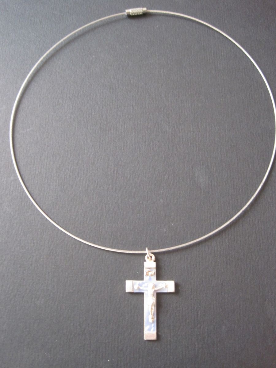 tour de cou mesurent environ 45cm et sont composés de fils d'acier recouverts d'une gaine fine de nylon transparent. Cette protection invisible évite toute irritation de la peau. Couleur argenté mat (gris) Le collier se ferment avec un fermoir à visser. D'une jolie ligne sobre,