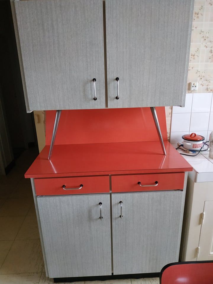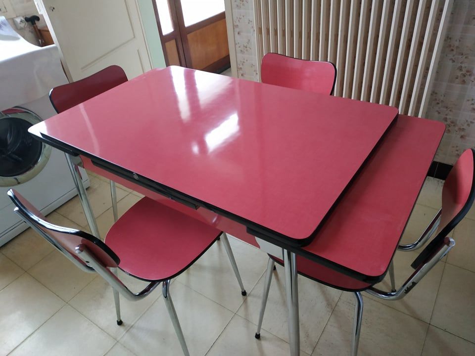 Meubles de cuisine en formica rouge (rose framboise) + gris en très bon état (année 1960) - une table avec deux rallonges et un tiroir