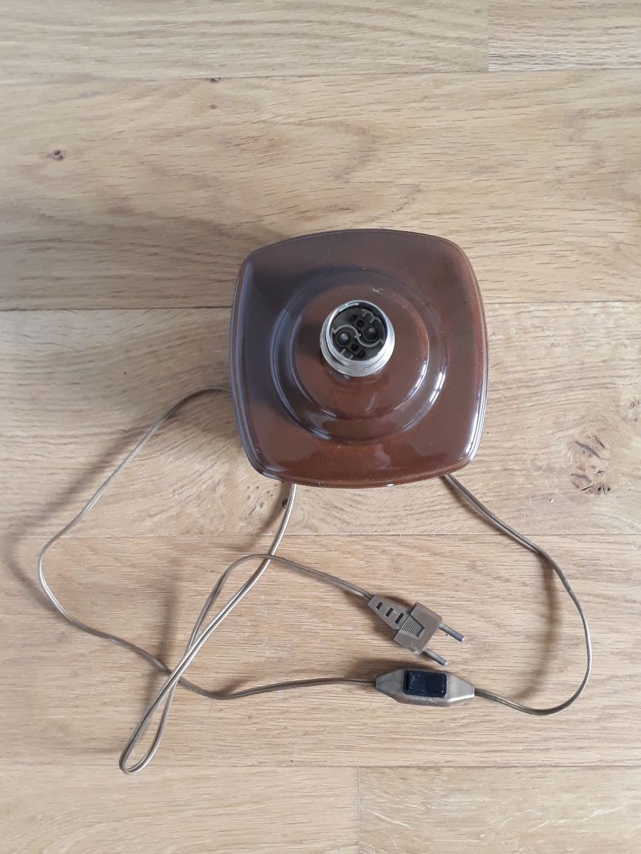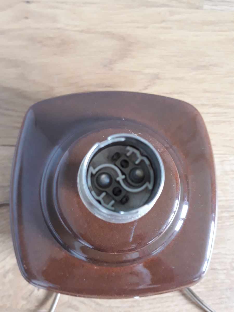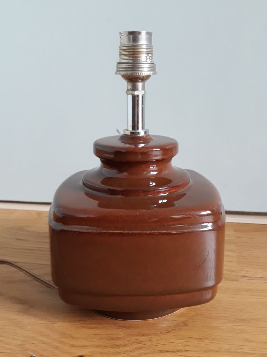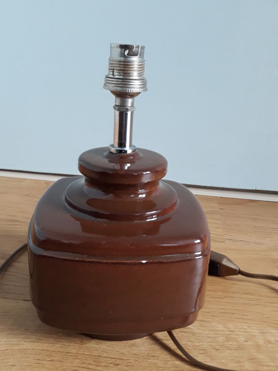 Jolie lampe à poser en céramique, elle date probablement des années 70. Son émaillage couleur chocolat et ses formes arrondies apporteront une touche chaleureuse, cosy à votre intérieur. Elle est vendue sans abat-jour, elle serait très belle avec une jolie ampoule vintage, mais si vous souhaitez ajouter un abat-jour, c'est possible mais il vous faudra trouver la petite « rondelle » à visser sur la douille pour maintenir l'abat-jour en place, car cette rondelle est manquante (et elle a un diamètre légèrement plus petit que les rondelles que j'ai en stock!). La partie électrique est d'origine il me semble. La douille pour ampoule à baïonnette est en métal argenté, l'interrupteur et la prise sont en plastique moulé. J'ai testé la lampe, elle fonctionne. Elle est en bon état général mais ne cache pas son âge : un léger piquetage ou voile sur le métal, deux petits éclats et de petites rayures sur l'émaillage. Elle mesure 20 cm au plus haut, la céramique mesure 13 cm de largeur environ pour 14 cm de hauteur. Elle pèse environ 700 g.