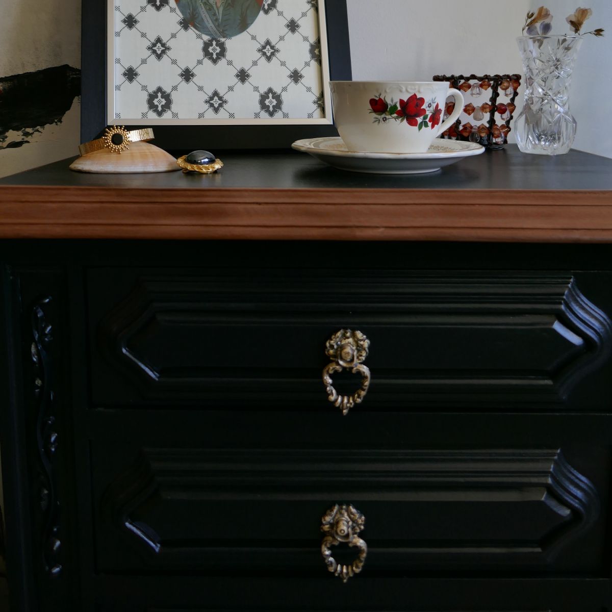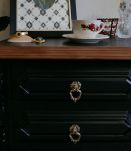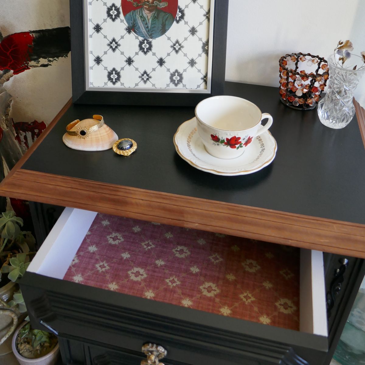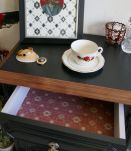 L'intérieur des tiroirs est peint en gris clair et habillé de papier sur les tons de bordeaux, au style chic.