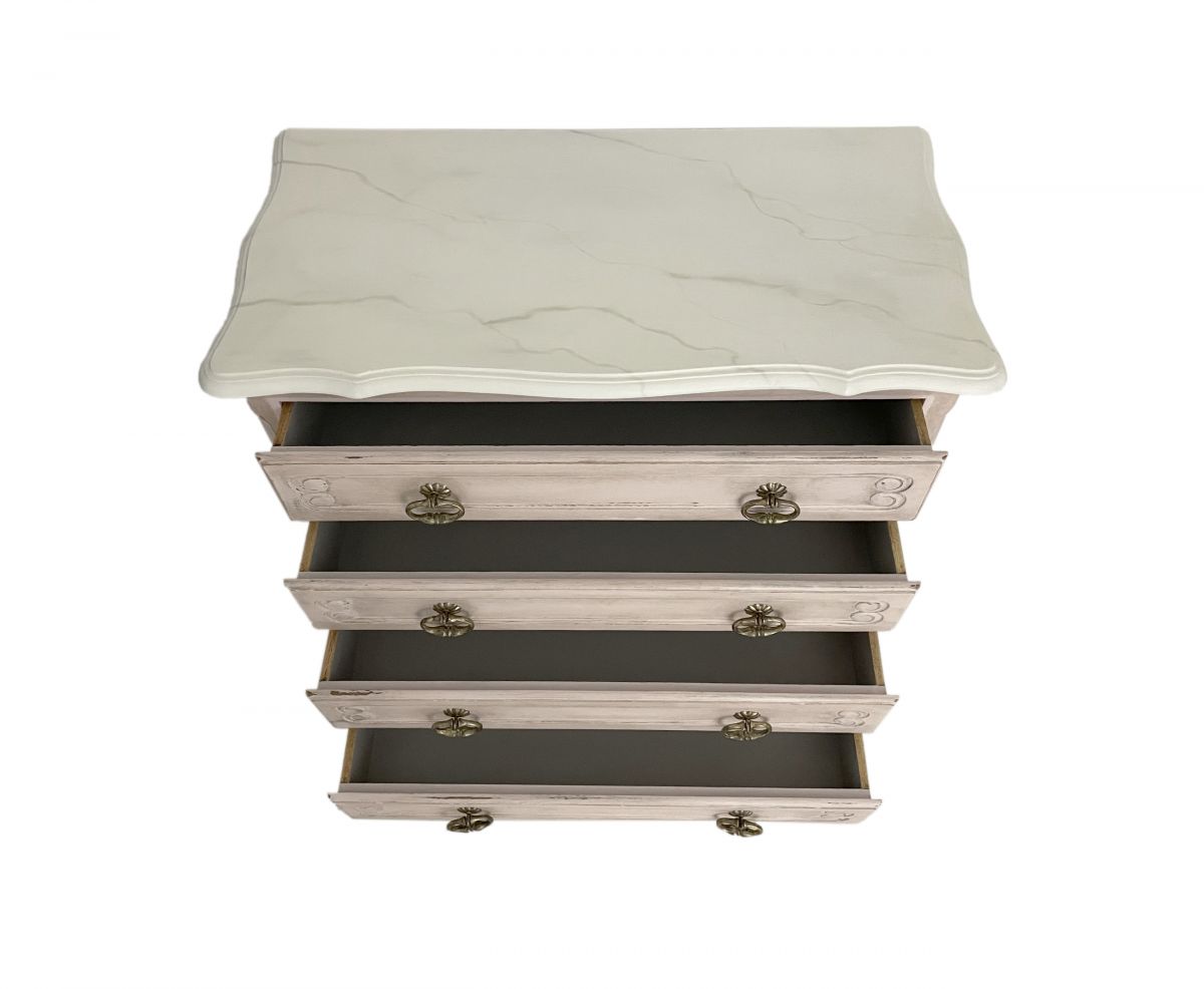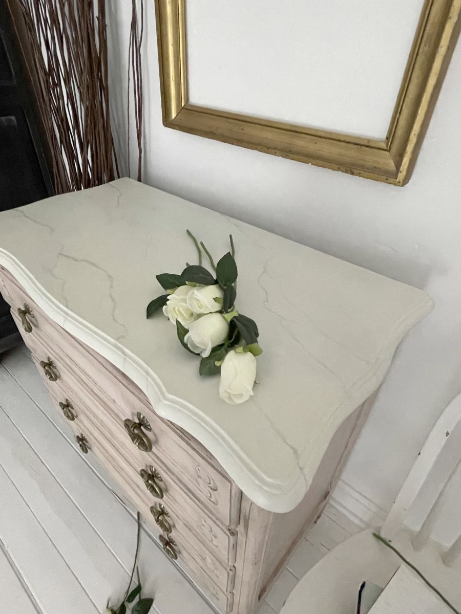 Une commode en bois massif restylée avec des peintures à la craie Antoinette Pink, Old White et Graphite. Scellé avec de la cire claire et foncée pour donner un aspect vieilli.
