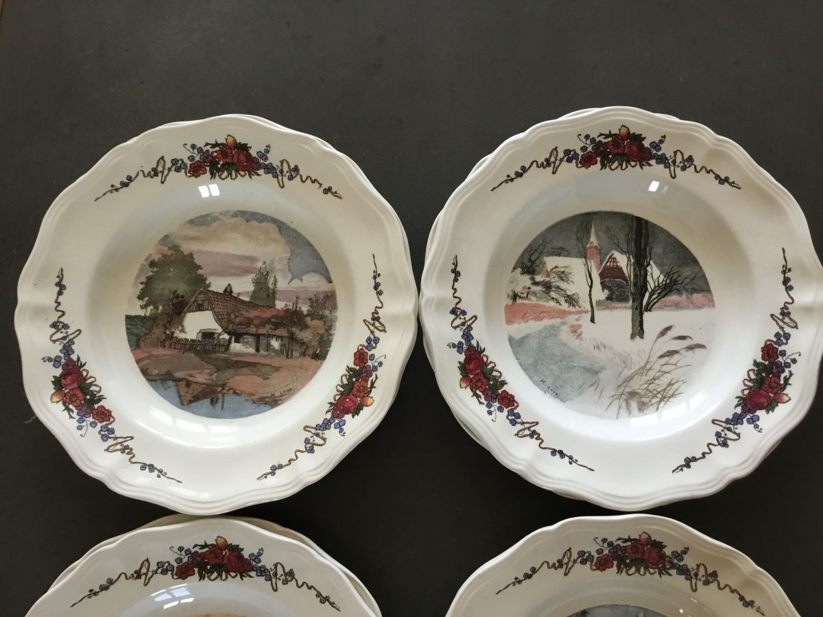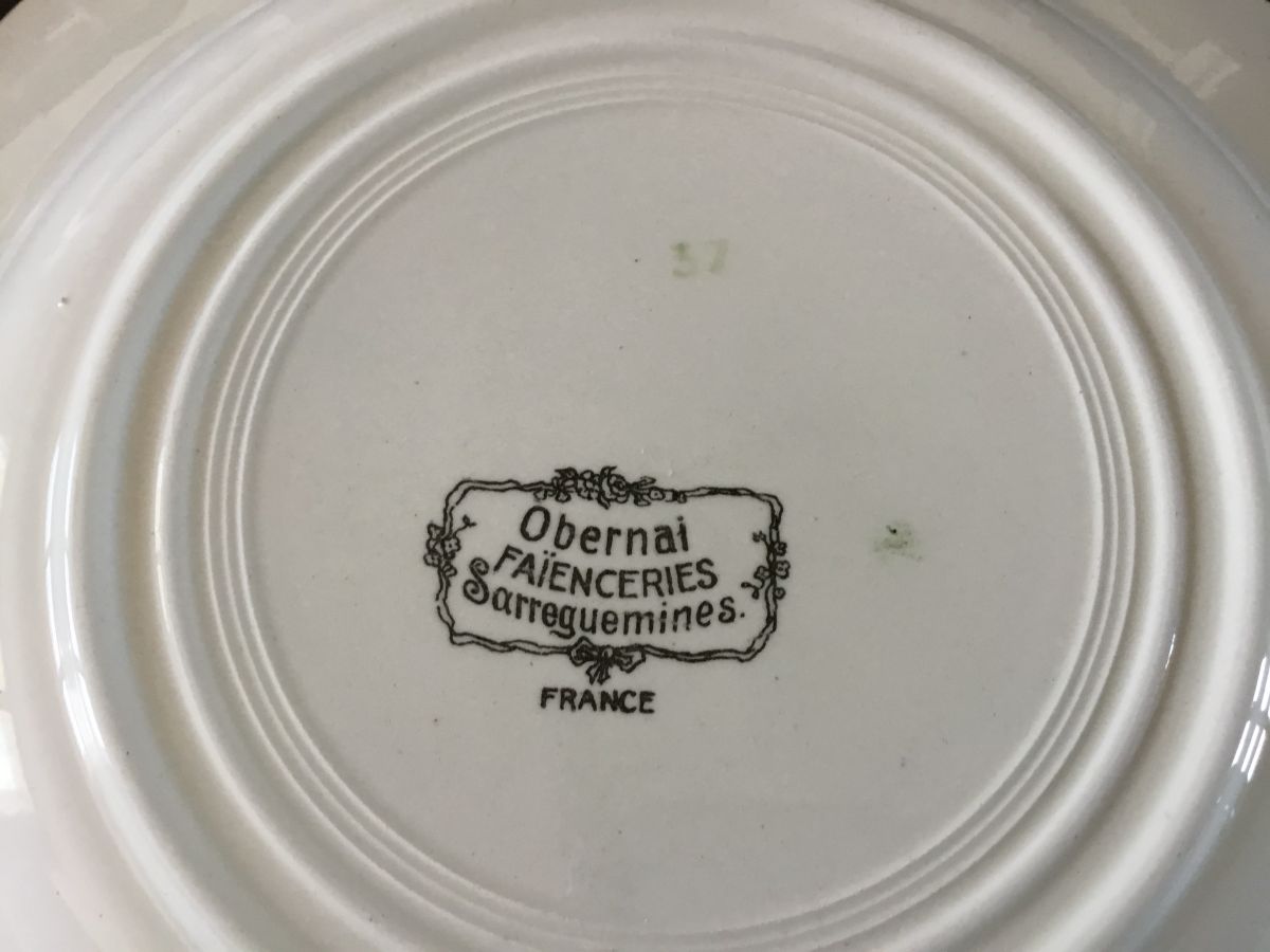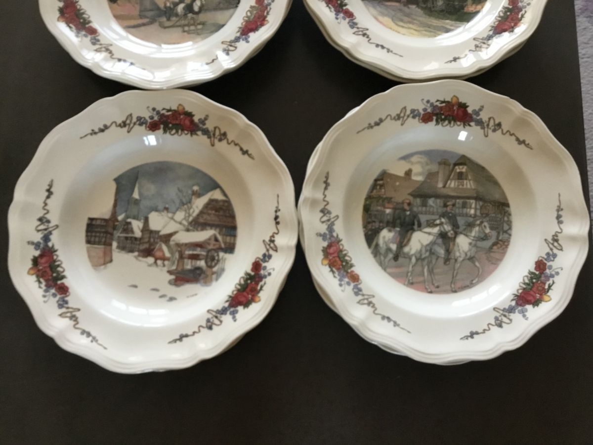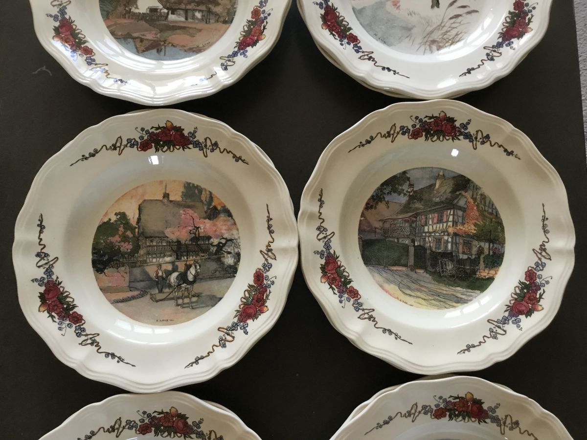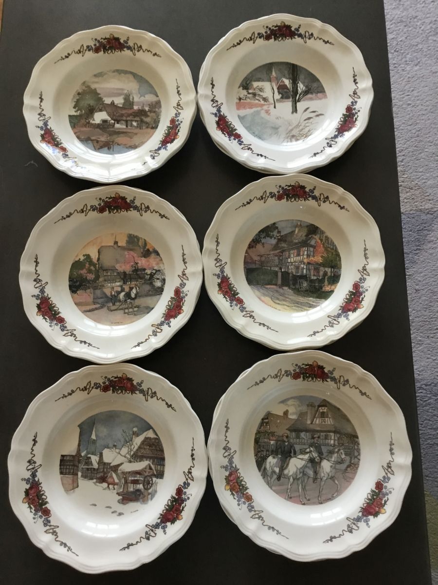 Lot de 6 assiettes creuses en faïence de sarreguemines modèle obernai. Illustration de henri loux et signature sur motif dans le décor de chaque assiette. Service en très bon état. Diamètre de l’assiette 25 cm.
