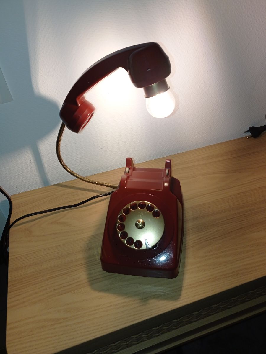 Téléphone lampe à poser sur la base d'un téléphone S63 Socotel des années 70 couleur bordeaux lie de vin (coque combiné)et or ( douille E27 en bakélite, col de cygne articulé de 30 cm et cadran, cordon d'alimentation avec interrupteur de 1.5m).
