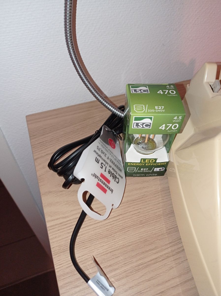 Toute la partie électrique est neuve, douille bakélite, cordon d'alimentation avec interrupteur de 1.50m, aux normes, ampoules led éco fournie.