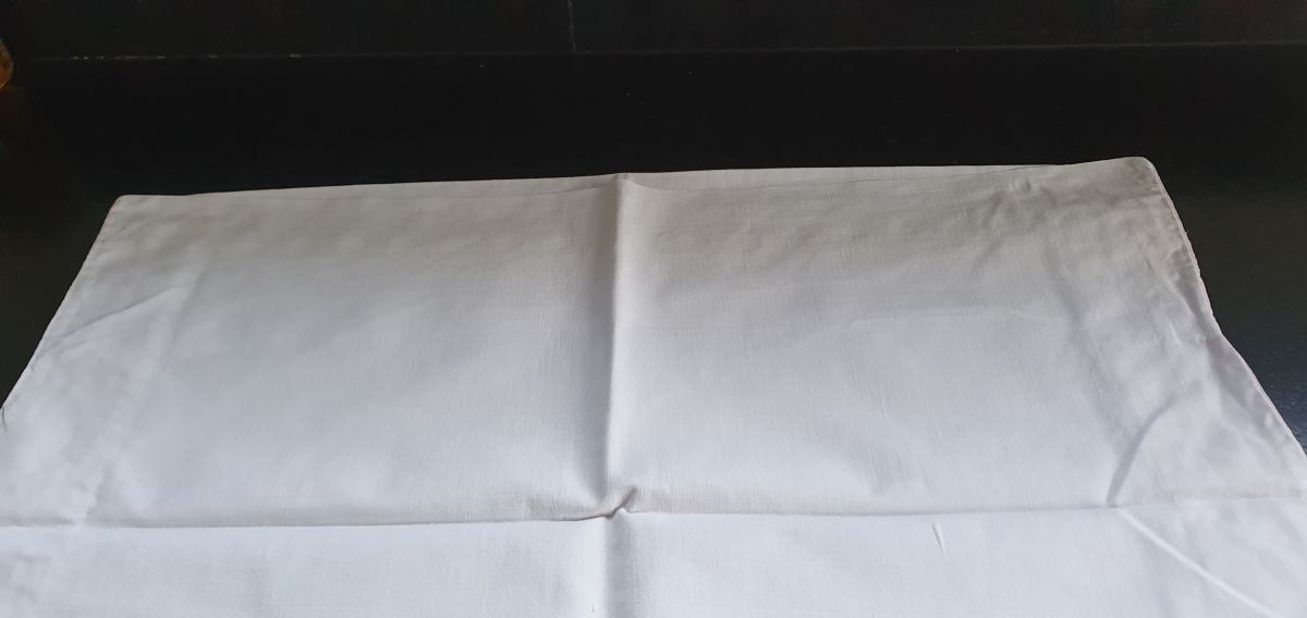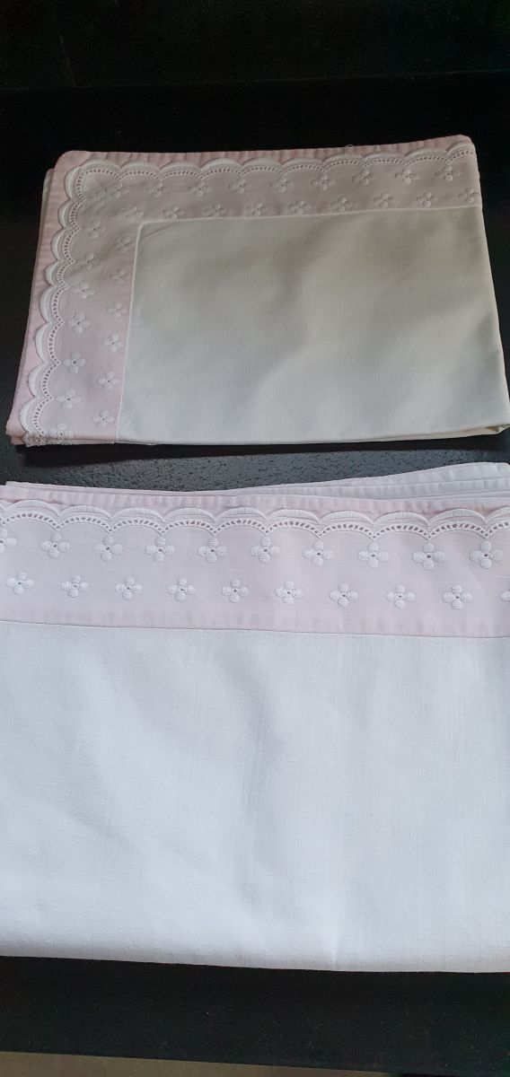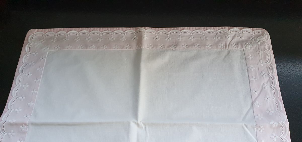 Blancs, avec le tour rose pâle, recouvert d'une bande brodée blanche.
