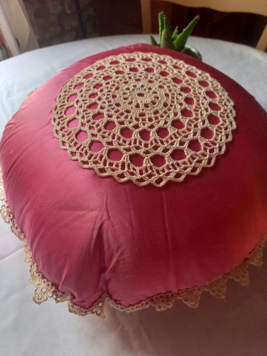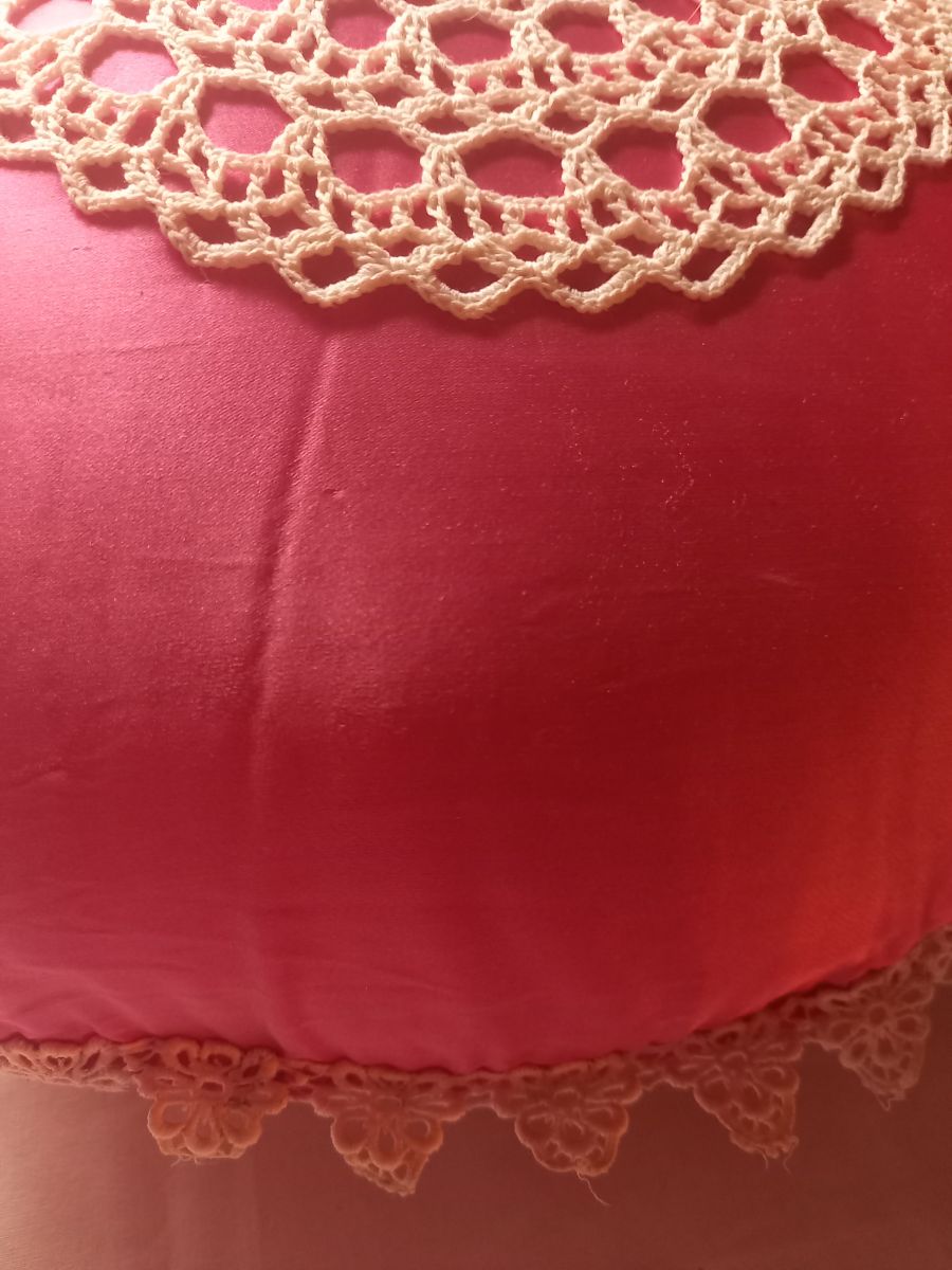 Coussin rond en satin vieux rose bordé de dentelle de crochet