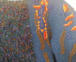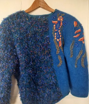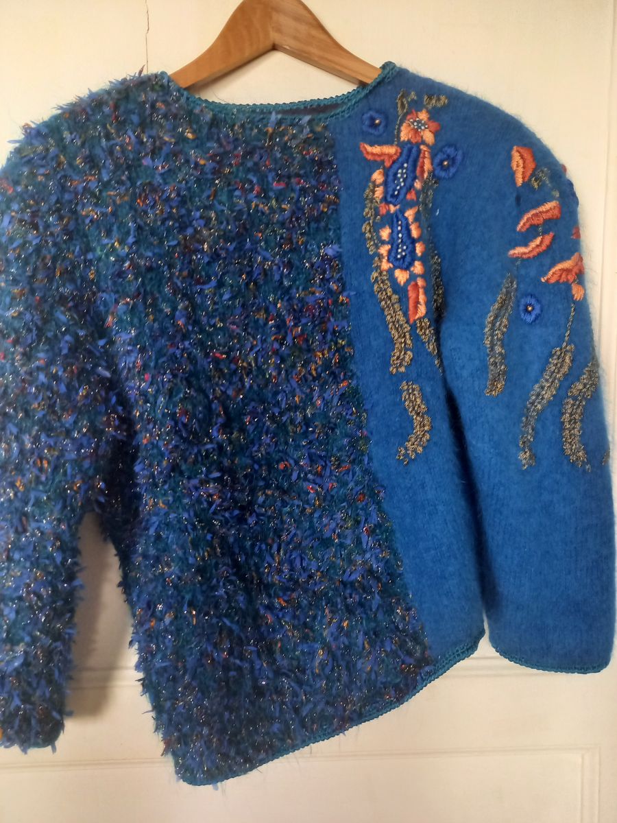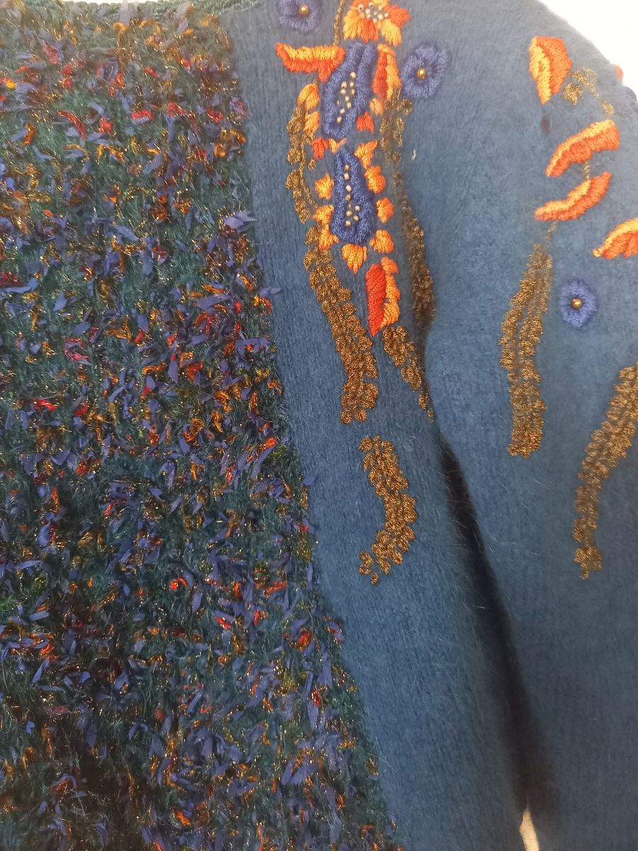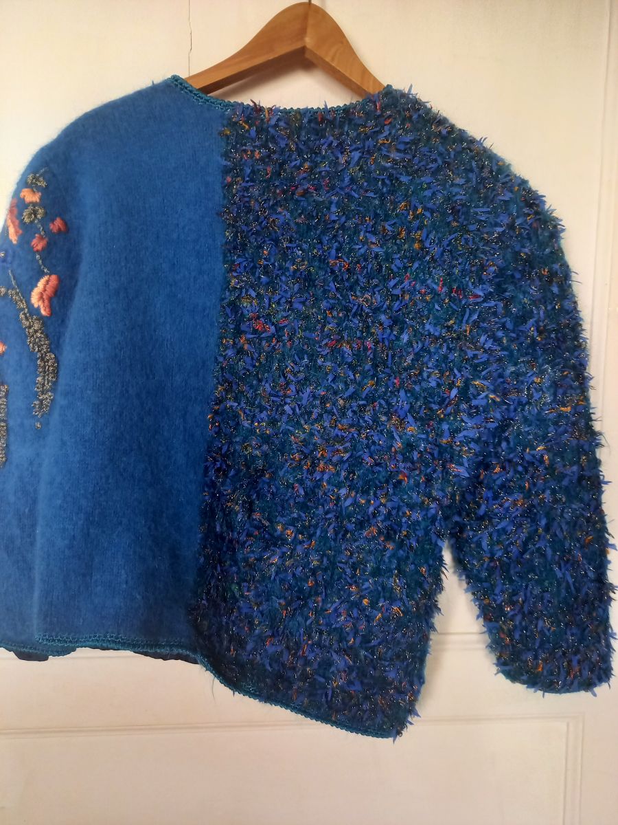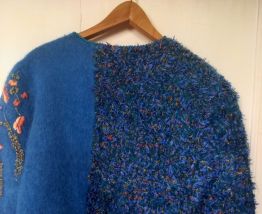 Pull en laine mohair bleu roi et incrustations de laine multicolore