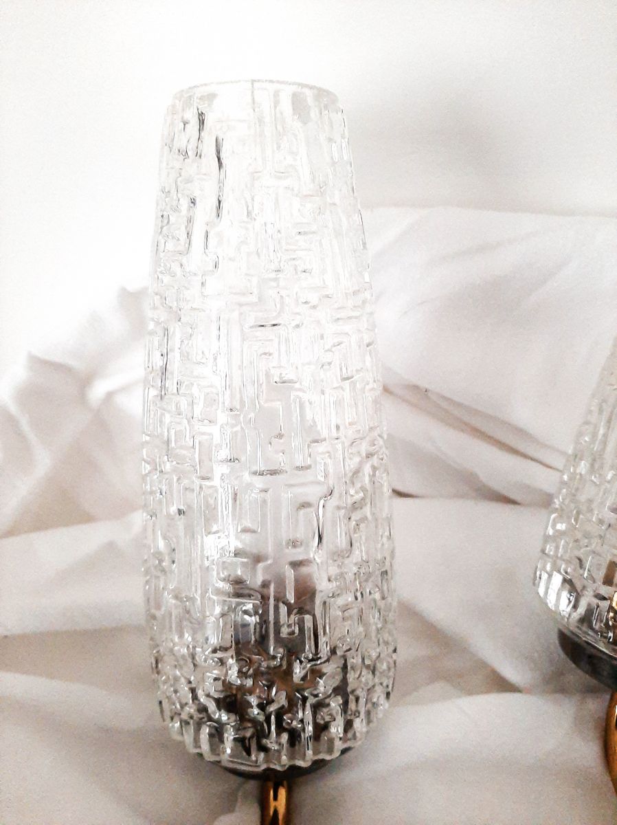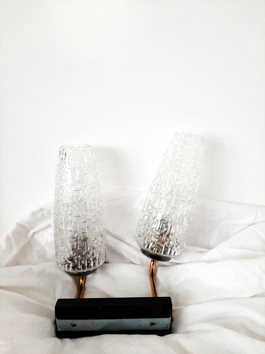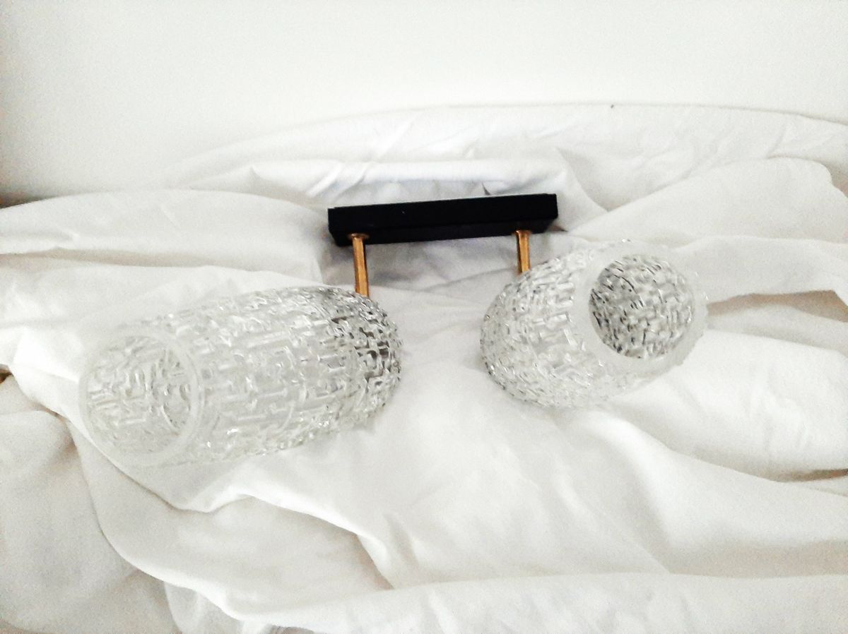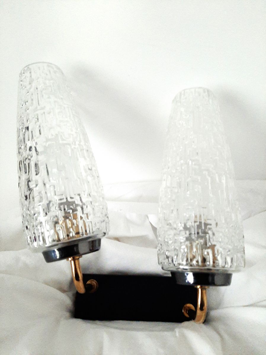 Applique murale double en bel état, fixation en métal noir et doré. 2 foyers avec abat jour de flûte de lustre; disposition originale 1 flûte droite et 1 flûte penchée. Fils électrique présent, ne sait pas si fonctionne.