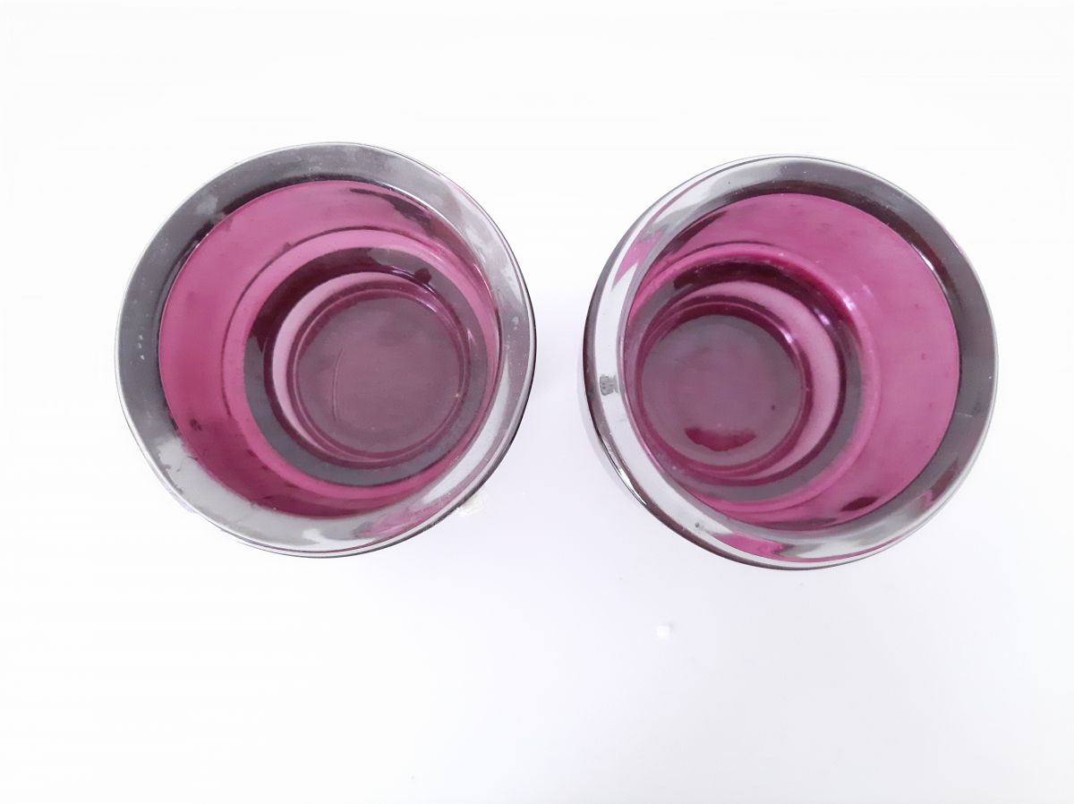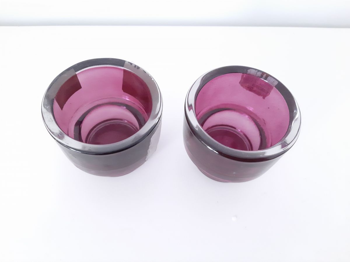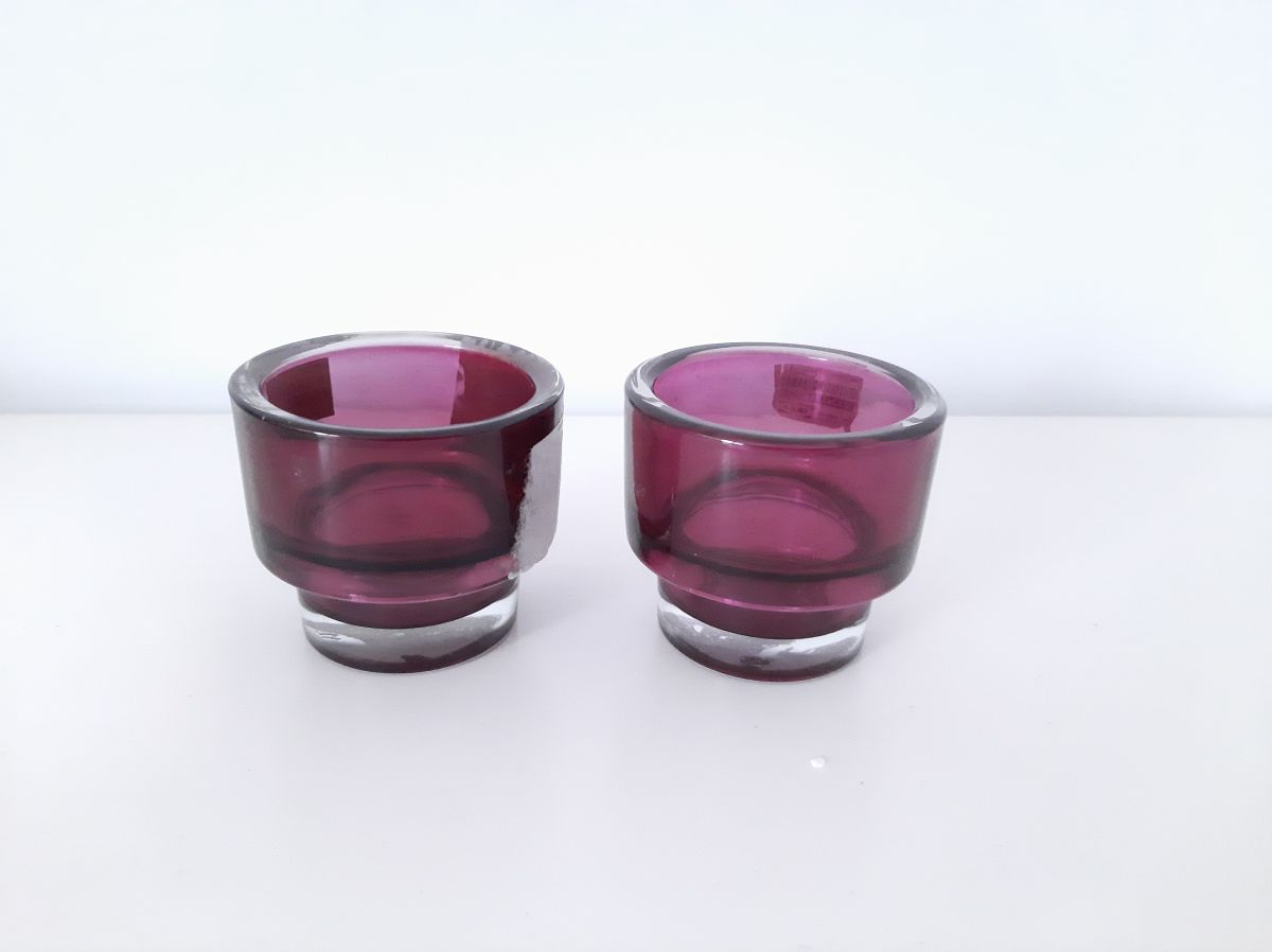 2 bougeoirs violet diamètre max 8cm, en verre. Marque ikea.Trace d usure. L étiquette est restée dessus. À enlever avec de l eau chaude