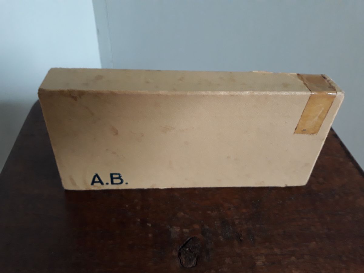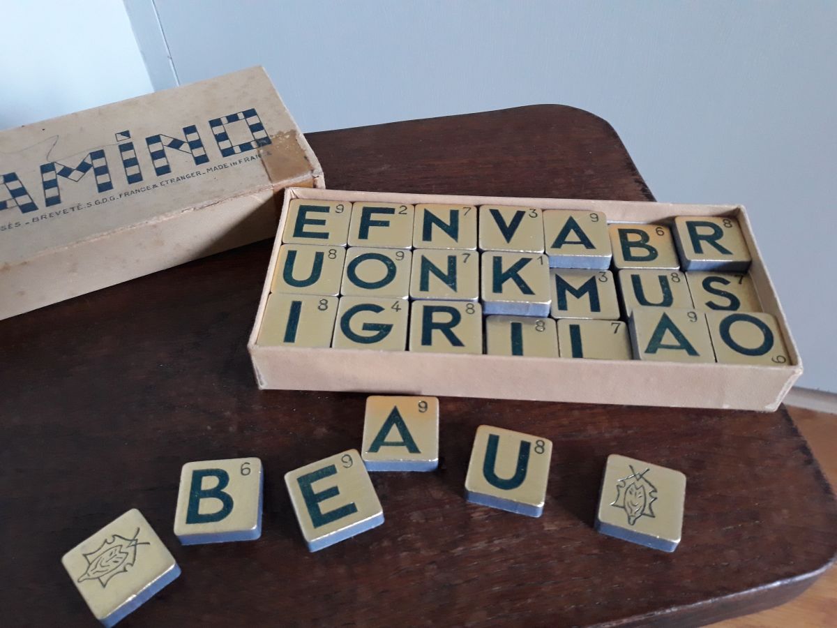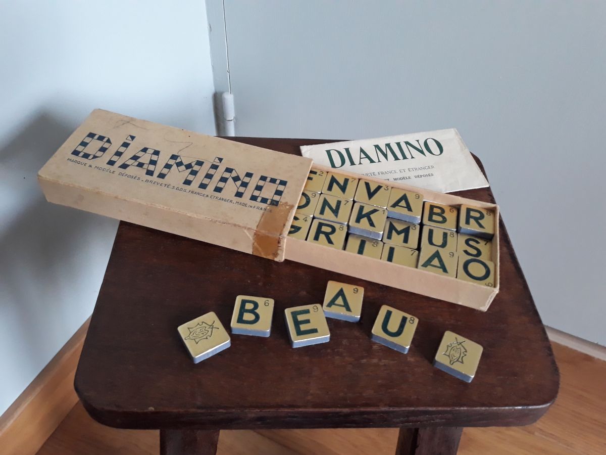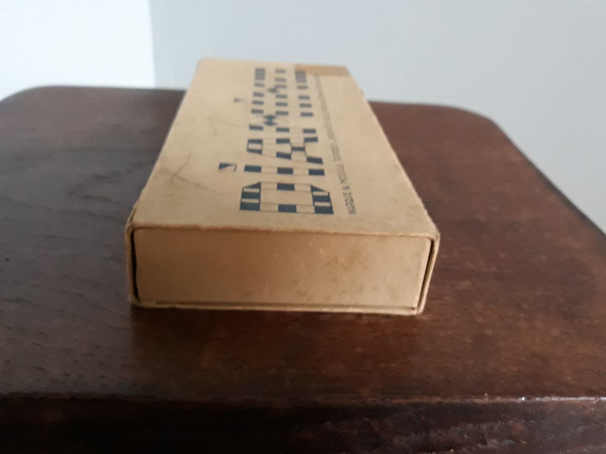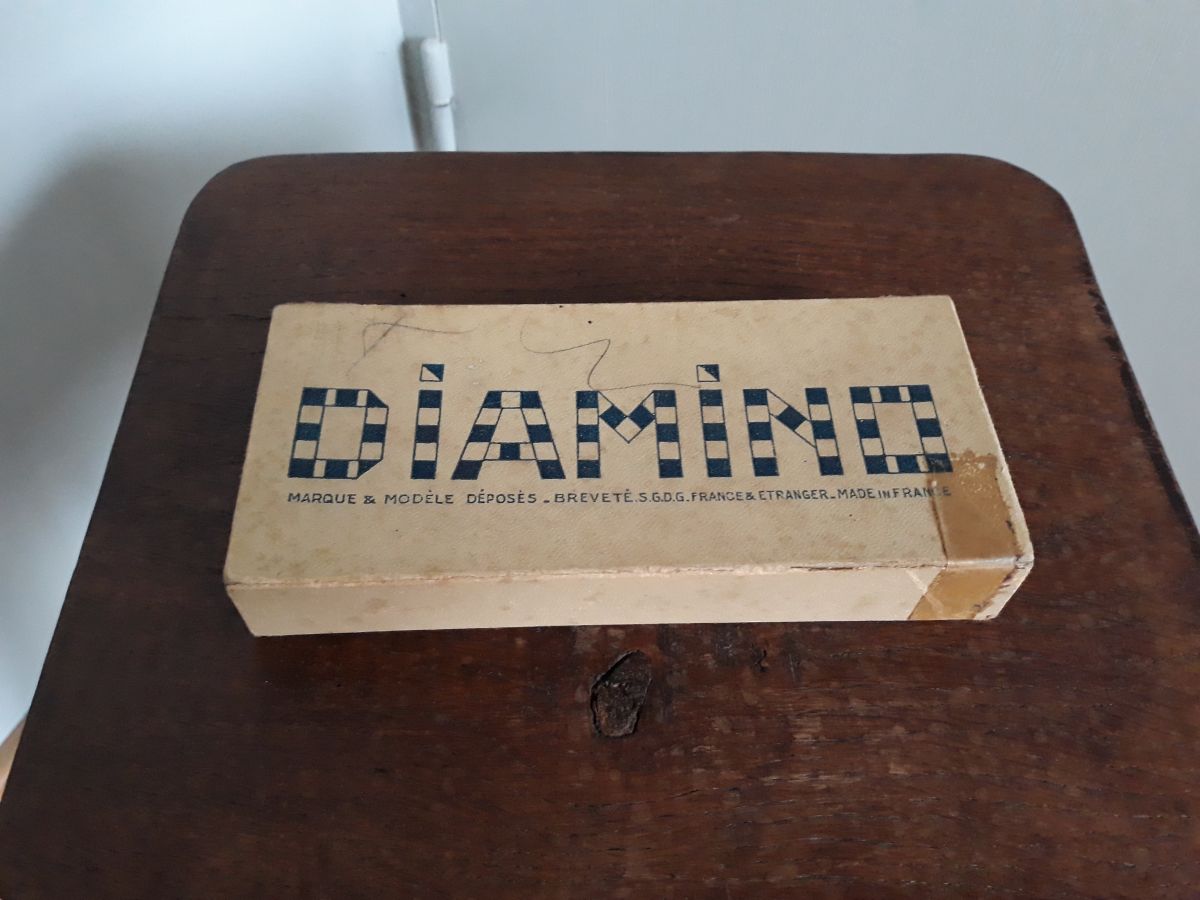 Ancien jeu de lettres Diamino dans sa boite d'origine. Il me semble complet : la règle du jeu est présente et pas d'emplacement vide dans la boite donc toutes les lettres doivent être là. Ce jeu a été inventé par madeleine Janssens veuve rousseau dans les années trente : la première édition date de 1935, celle présentée ici date d'avant 1968 car elle comporte la mention « breveté s.g.d.g. France et étranger). Ce jeu ne cache pas son âge : la boîte comporte des déchirures dont une réparée il y a longtemps par un bout d'adhésif, ainsi que des marques de crayon et taches. La partie cartonnée qui reçoit les lettres ne présente pas de déchirure, on peut donc encore ranger correctement les lettres. La règle du jeu présente de petites déchirures au niveau des pliures. Les lettres sont imprimées sur fond doré sur un carton épais, elles sont en bon état général mais présentent quelques petites taches et rayures et la dorure s'estompe par endroit. La boite mesure 16 cm par 7, 5 cm pour 2, 5 cm d'épaisseur et l'ensemble pèse 240g.