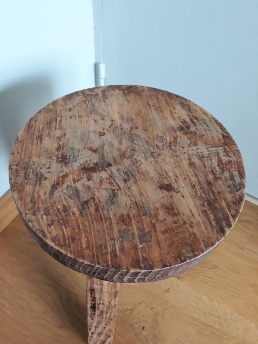 Quand ce tabouret est arrivé chez moi, il était recouvert d'un affreuse peinture chocolat très épaisse. J'ai (presque) tout ôté, à la main, en grattant avec différents outils. Puis je l'ai poncé légèrement et lui ai passé un peu de cire d'antiquaire. Ce qui lui donne cet aspect étrange, avec des marques et couleurs mêlées, bois brut à des endroits, bois patiné à d'autres, et restes de peinture. Il est en bon état général, stable et solide, mais ne cache pas son âge : un pied a été réparé, la réparation est visible mais efficace (je l'ai testée, on peut s’asseoir dessus sans problème). Il reste aussi des traces de peinture, des taches et marques diverses. En plein dans l'esprit wabi sabi, avec ses défauts, ses réparations, ses vies antérieures... Sous l'assise, j'ai laissé la peinture chocolat. Il mesure 38 cm de hauteur et l'assise a un diamètre de 26 cm pour une épaisseur de 3, 5 cm. Il pèse 1, 7 kg.